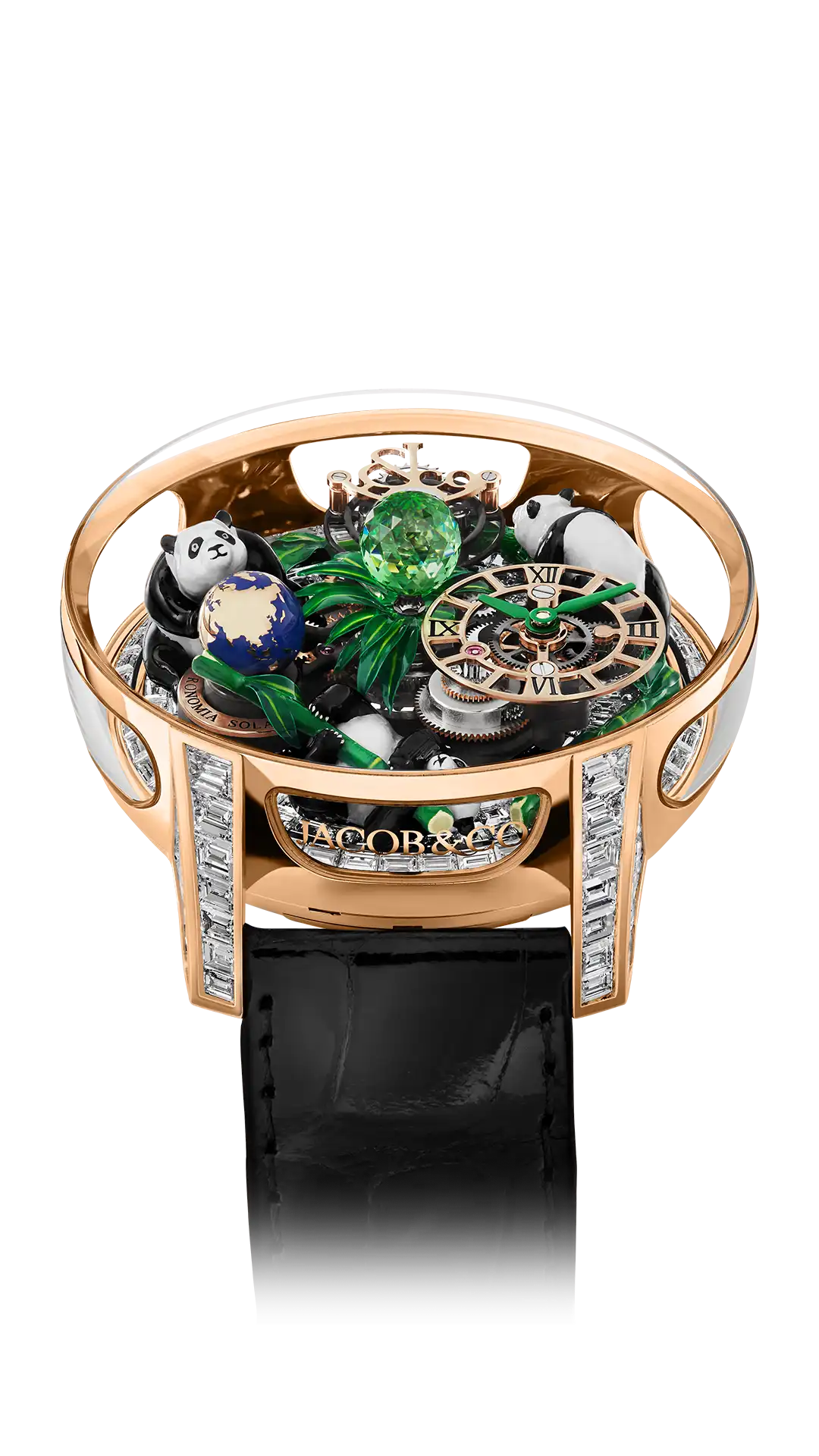 Hand-crafted miniatures. Vertical movement. Double-axis flying tourbillon. Spinning diamond moon. Spinning earth. Off-centered dial. 60-hour power reserve. 384 components.