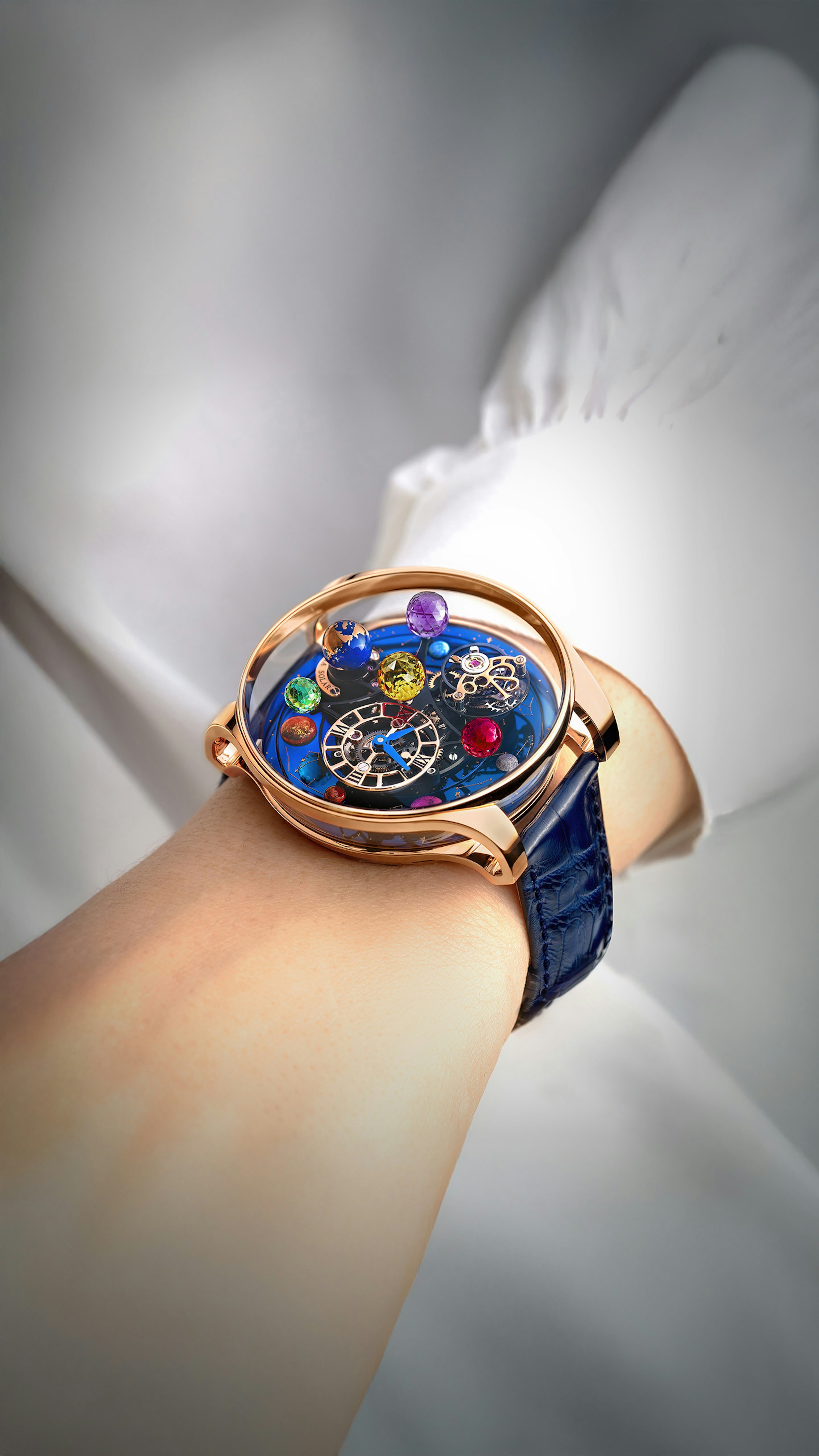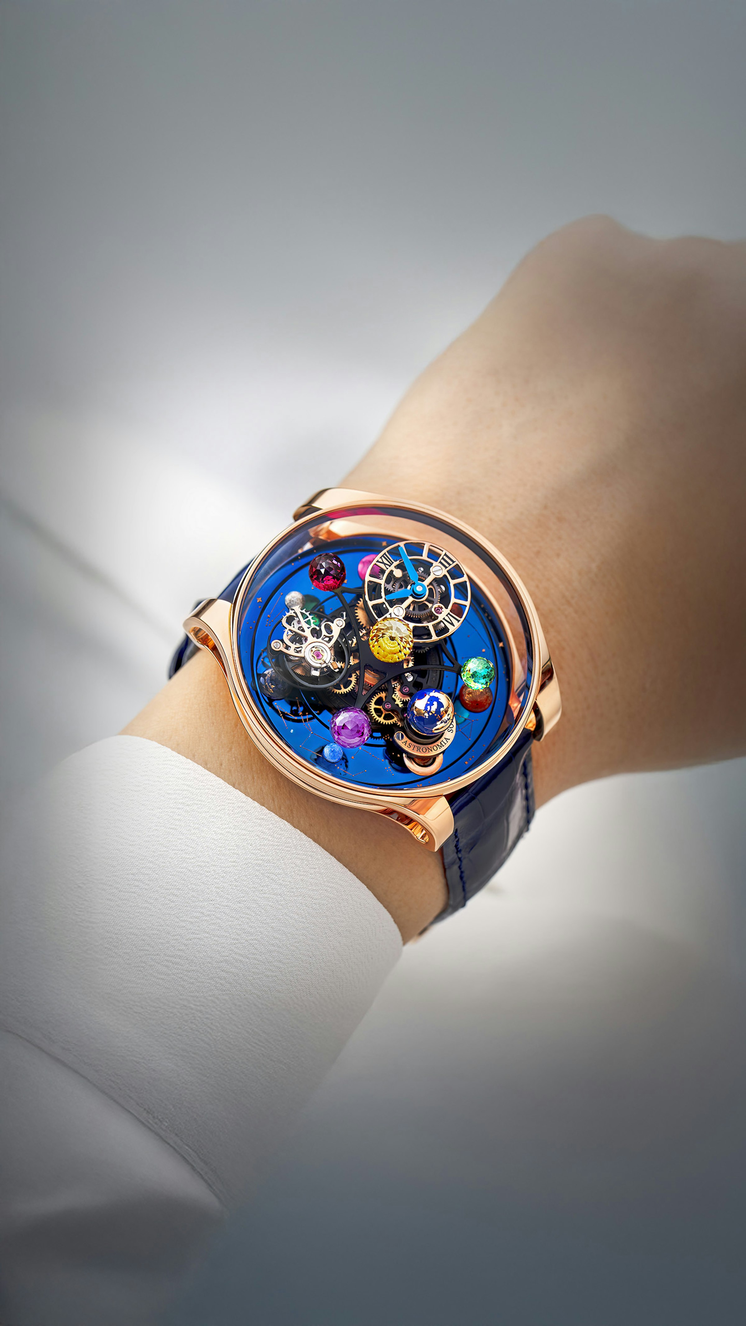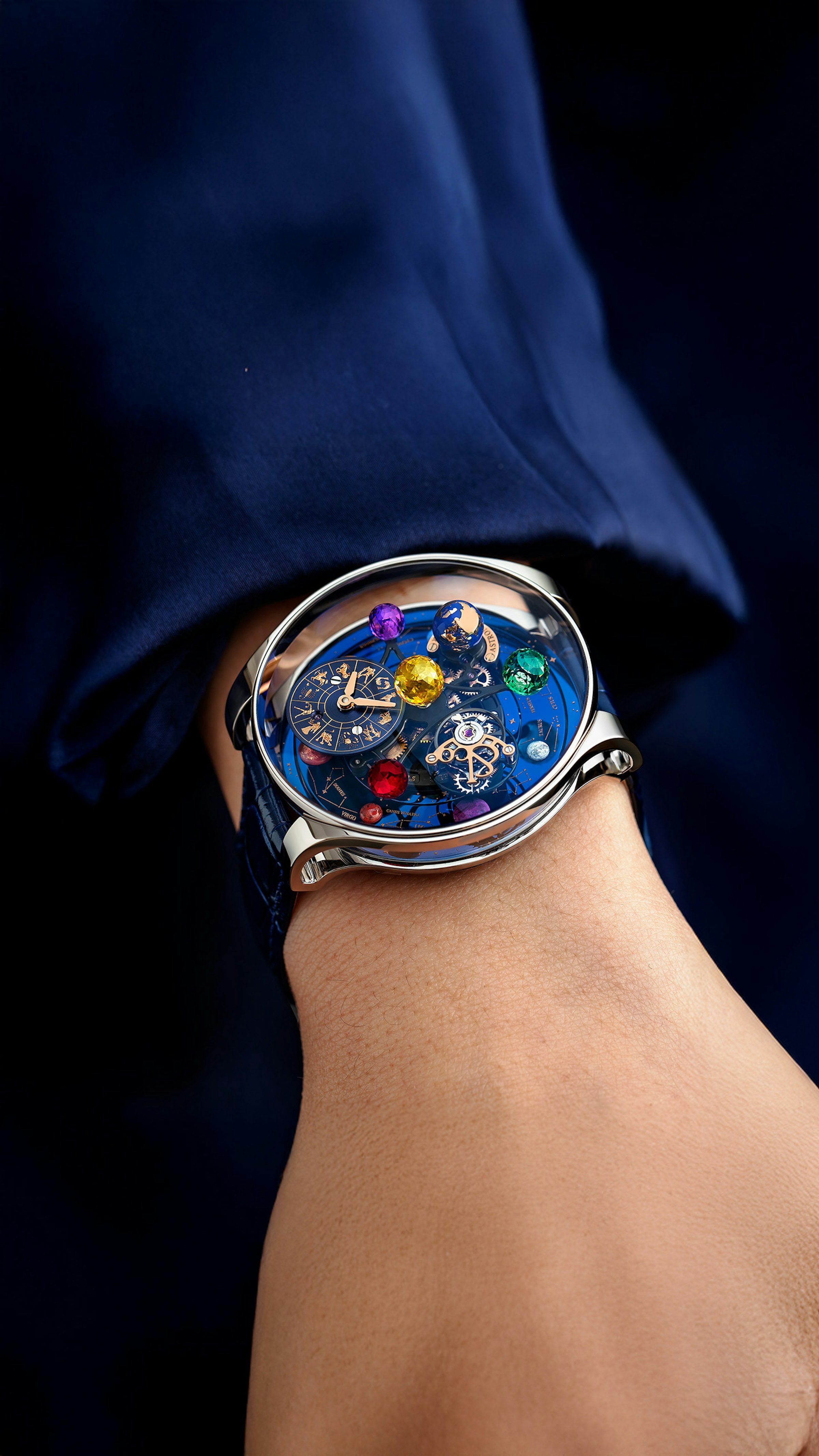 One full movement rotation in 10 minutes. Rotating Jacob-cut planets. Double-axis flying tourbillon. Spinning diamond moon. Orbital dial. 48-hour power reserve. 447 components.