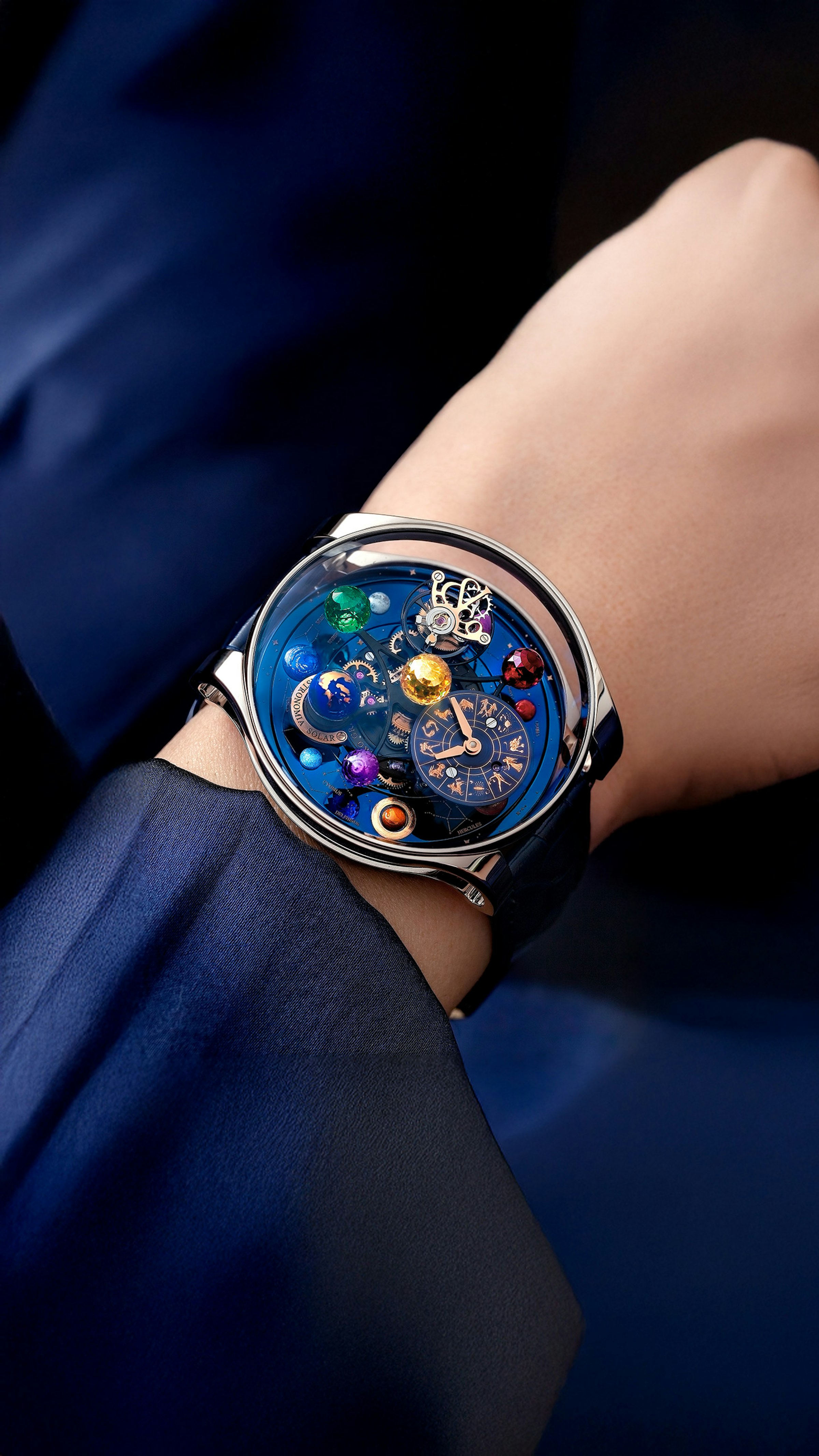The satellite arms carry three gem-made planets, spinning at the same 10-minute per rotation speed as the large central sun that dominates it all. Another part of the platform bears a Jacob-cut, 288-facet diamond moon and a rotating earth globe. The titanium base is also spinning counterclockwise in ten minutes, and is inlaid with another seven planets.