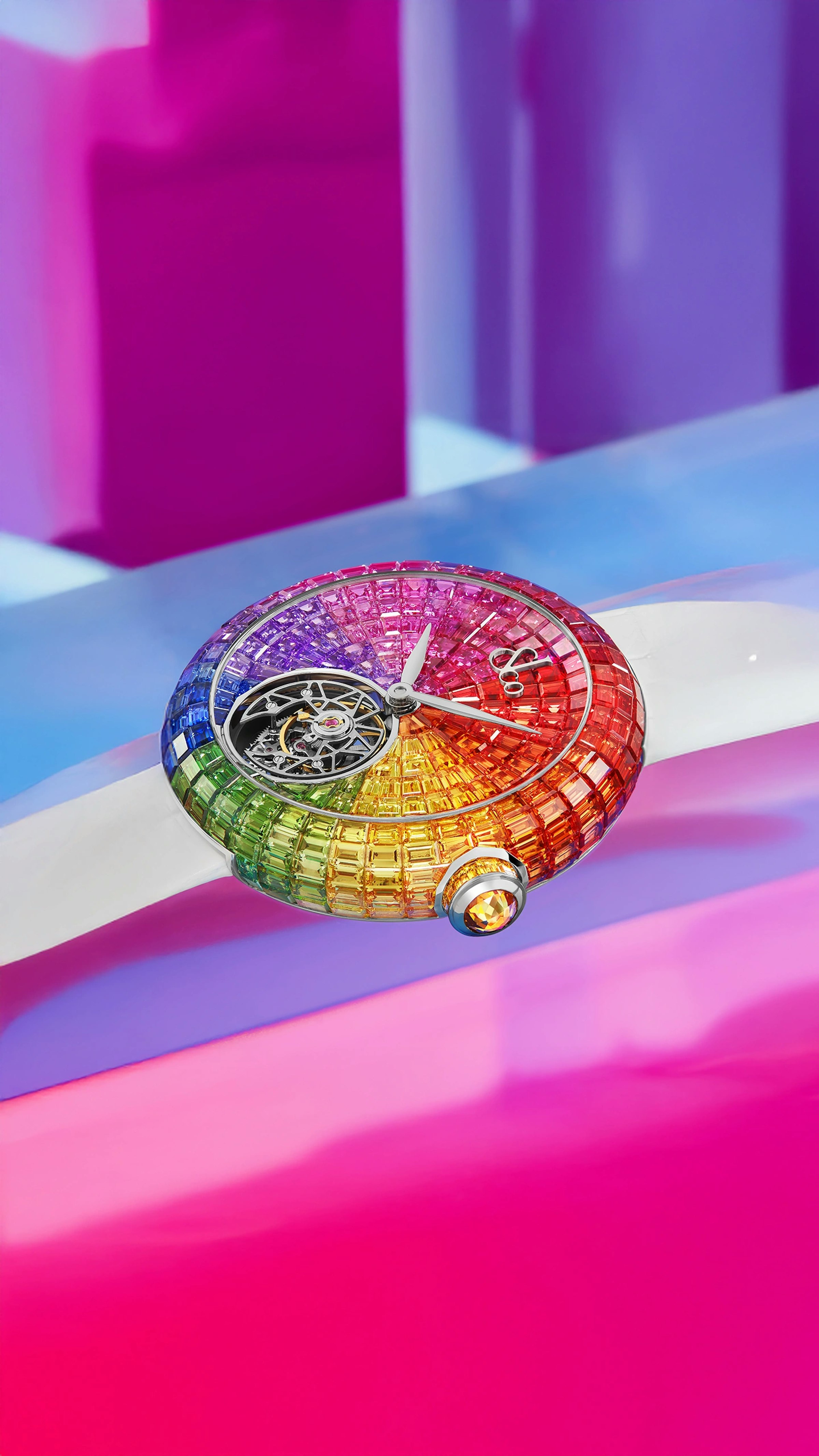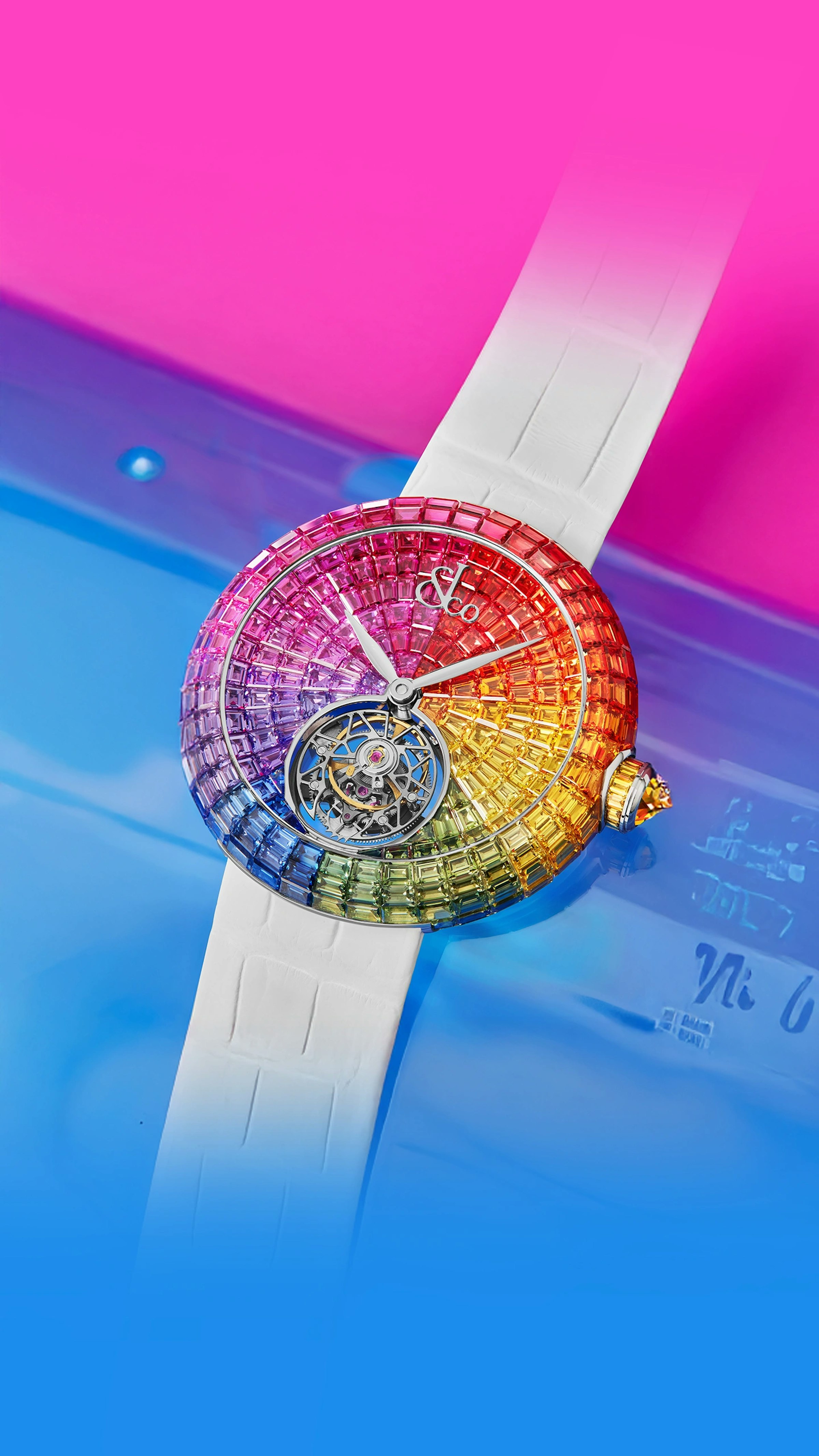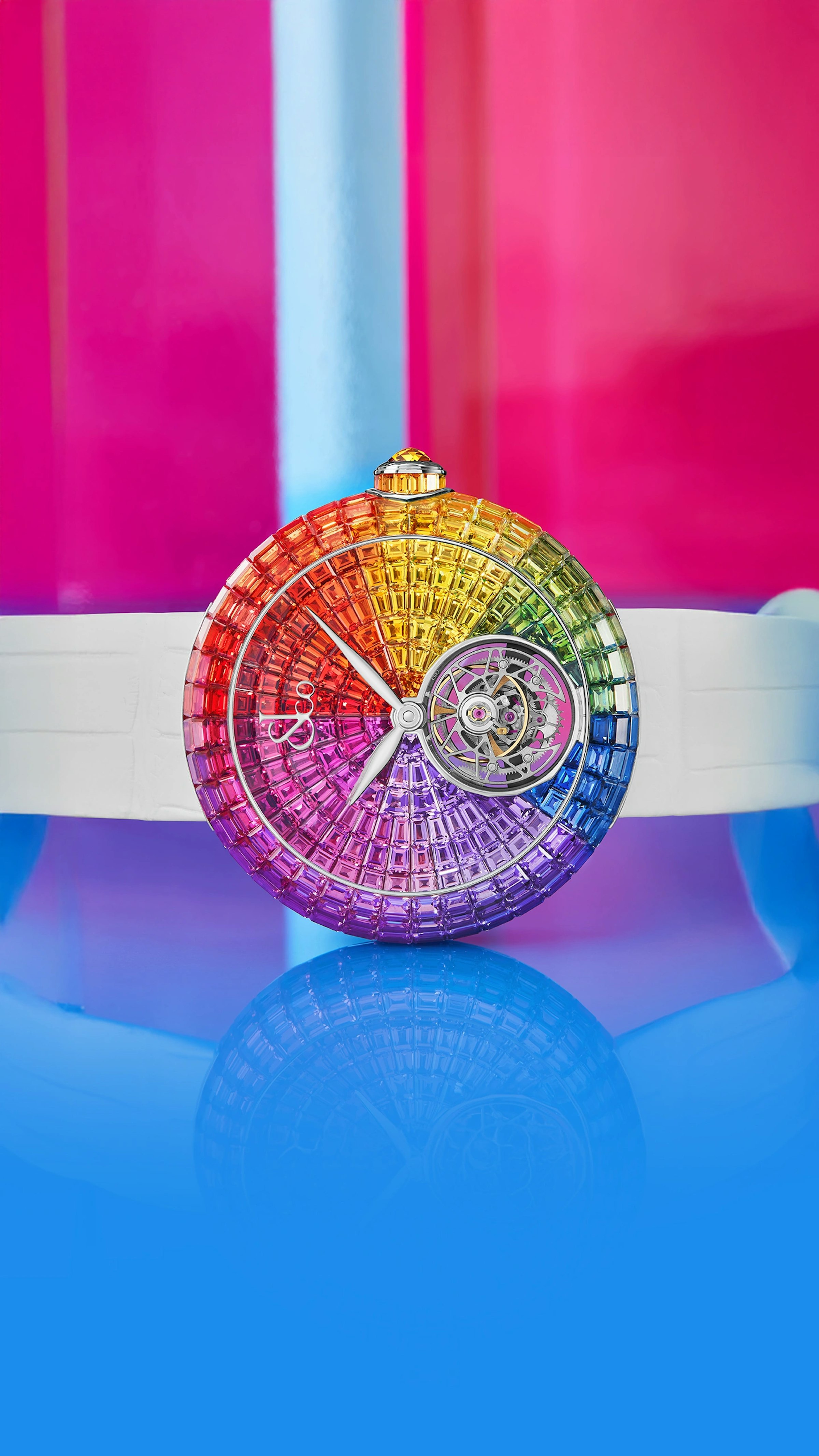 From a creative concept to design inspiration. To the first stroke of a pencil through hundreds of iterations. A timepiece like no other comes to life. Brilliant Flying Tourbillon is Jacob & Co.'s high watchmaking and high jewelry creativity expressed in abundant color and gem.