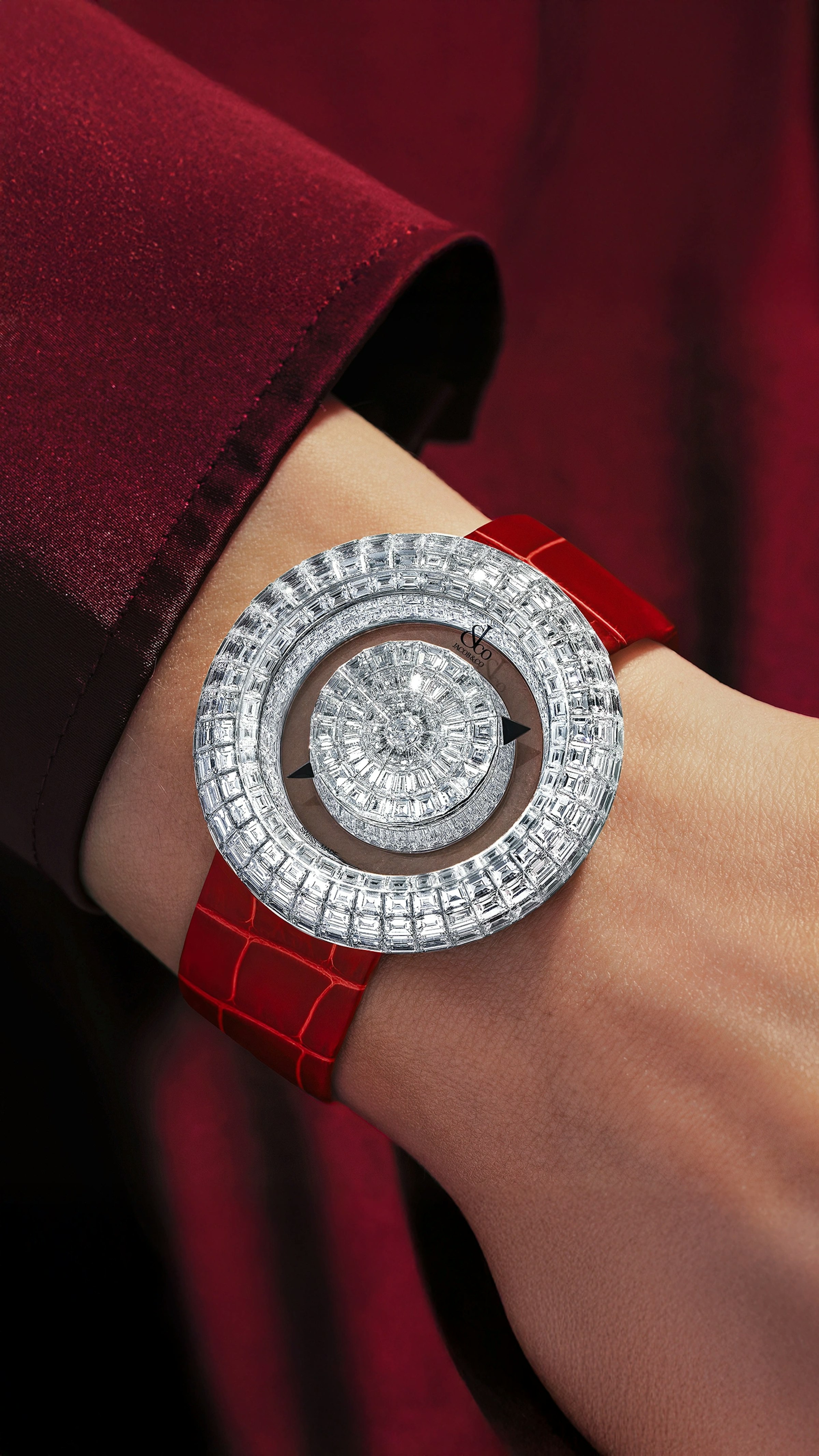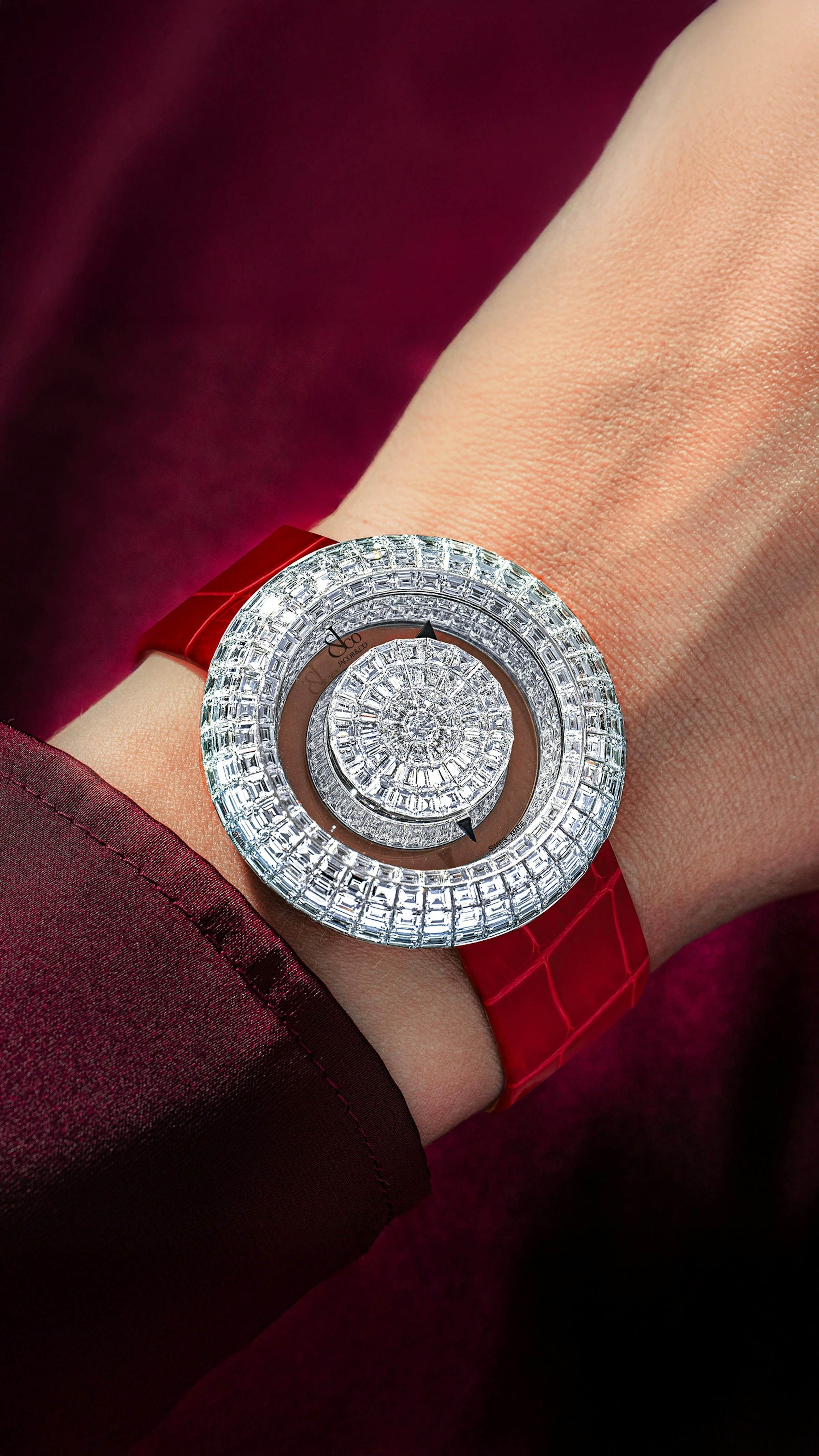 The ring-shaped case of Brilliant Mystery is a one-of-a-kind three-dimensional creation. Shaped like a donut, it offers the largest surface imaginable for the kind of creativity Jacob & Co. is famous for. The invisible-setting is a 360 degree process, covering all edges from the outside of the case and the inner island.