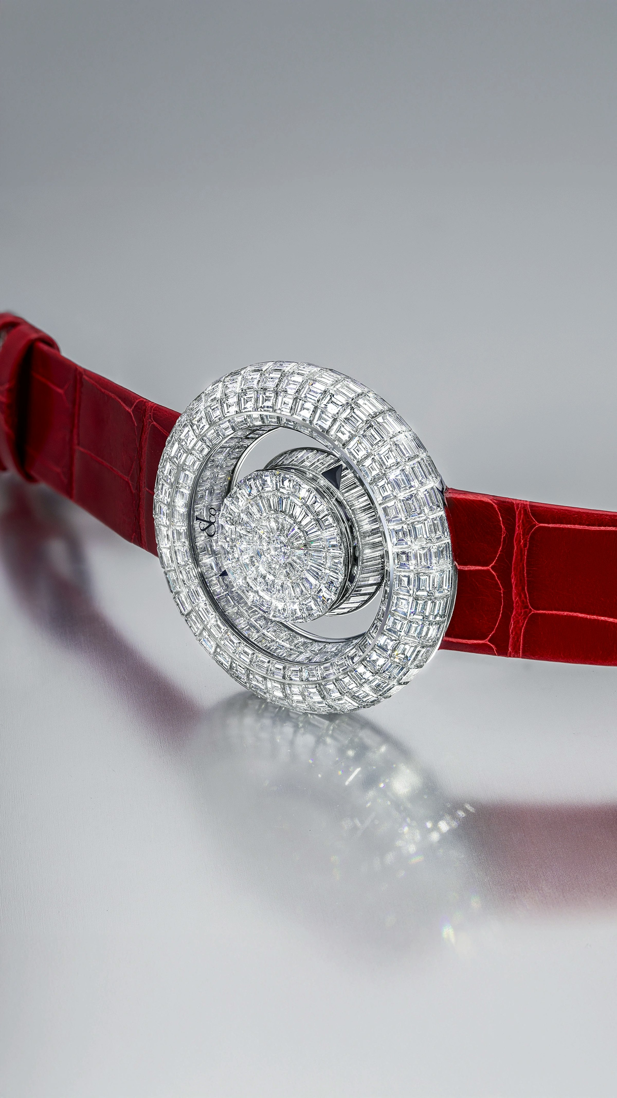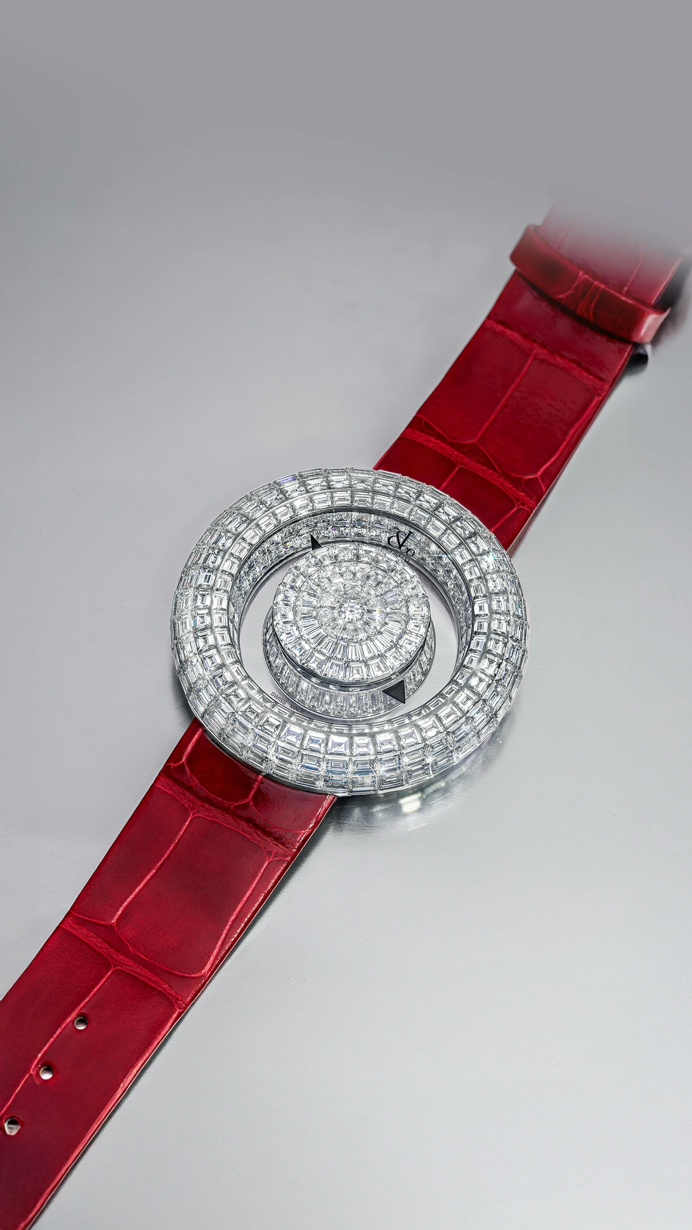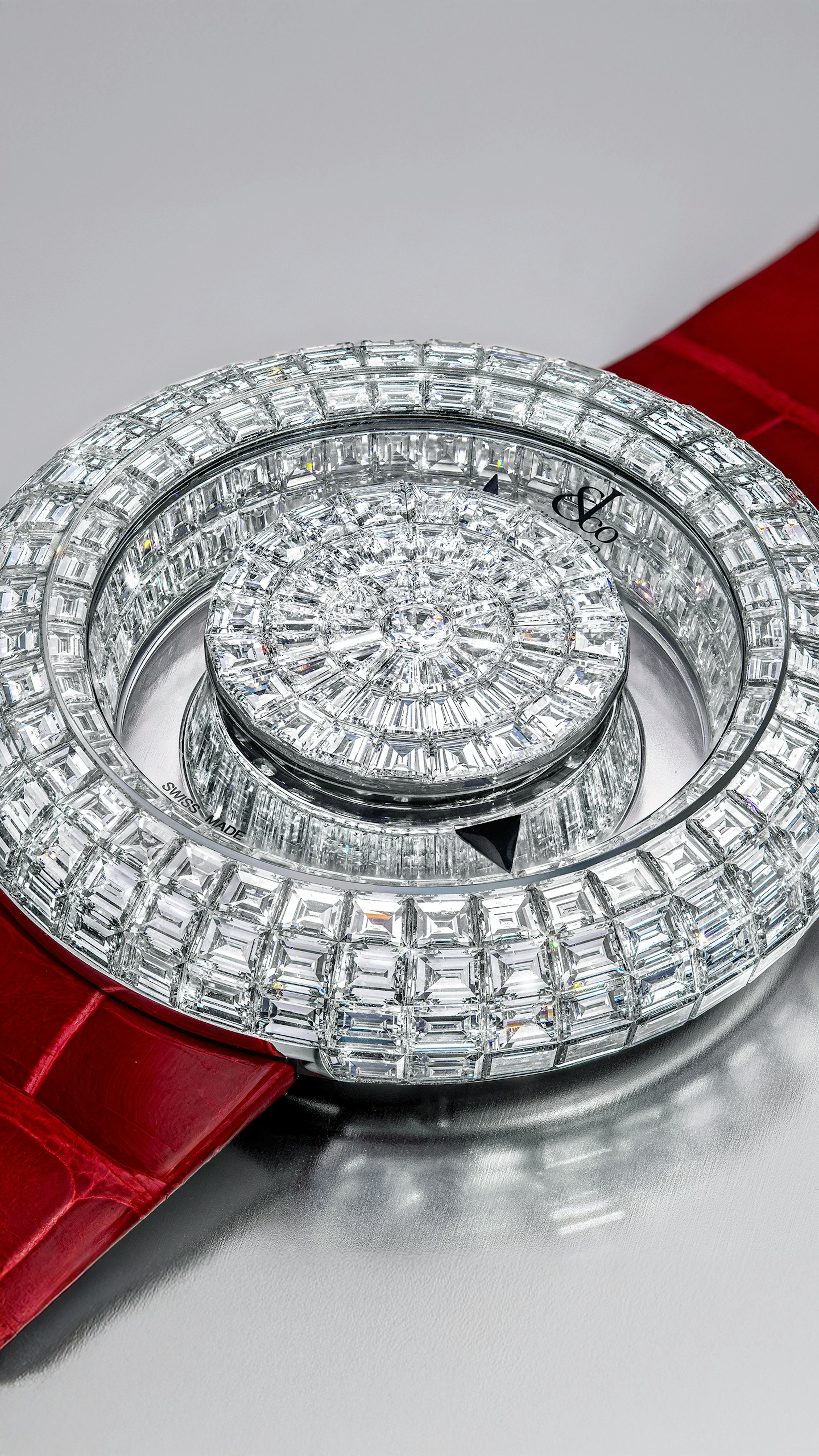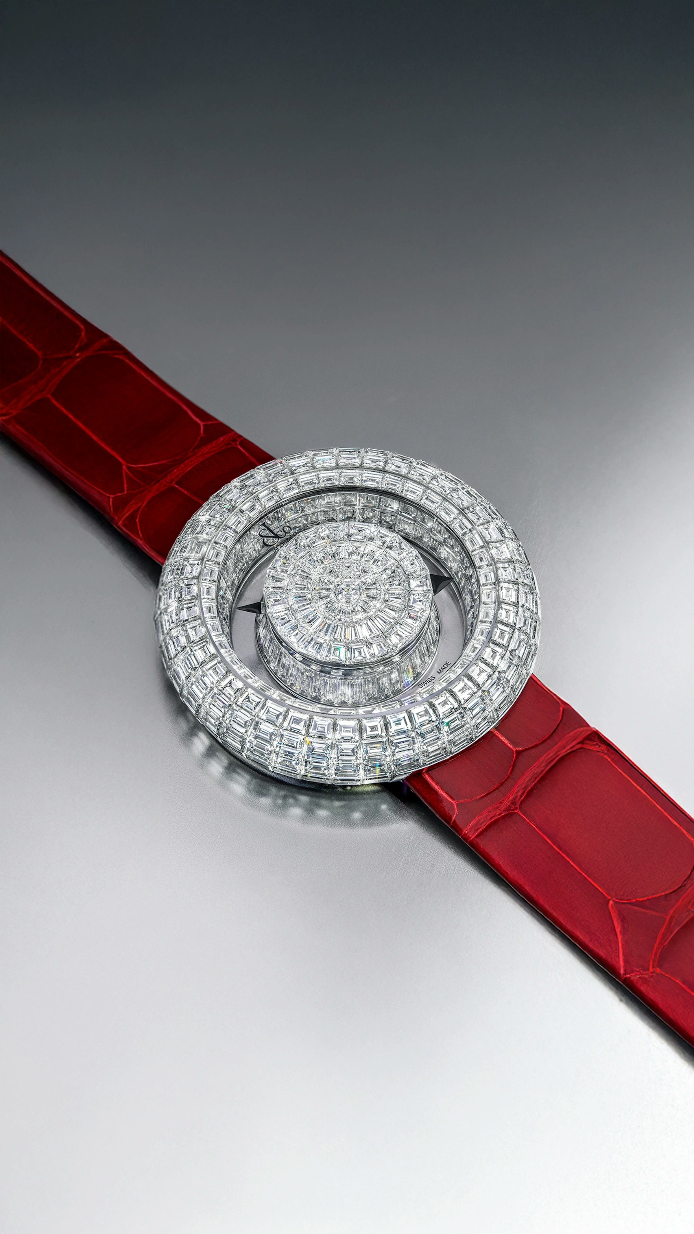 38-mm rose gold case invisibly-set with 252 baguette-cut white diamonds (19.40 ct.). Mysterious central movement with floating hands.