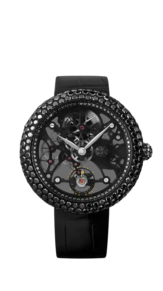 Caliber JCAM01 uses shapes and finishings to express the femininity in Brilliant Skeleton Northern Lights. Curves, elegant lines, symmetrical design, even the Jacob & Co. logo has become a part of the watchmaking expression. Whether they're revealed by a transparent crystal or shrouded in mystery by a colored one is entirely up to the ultimate wearer.