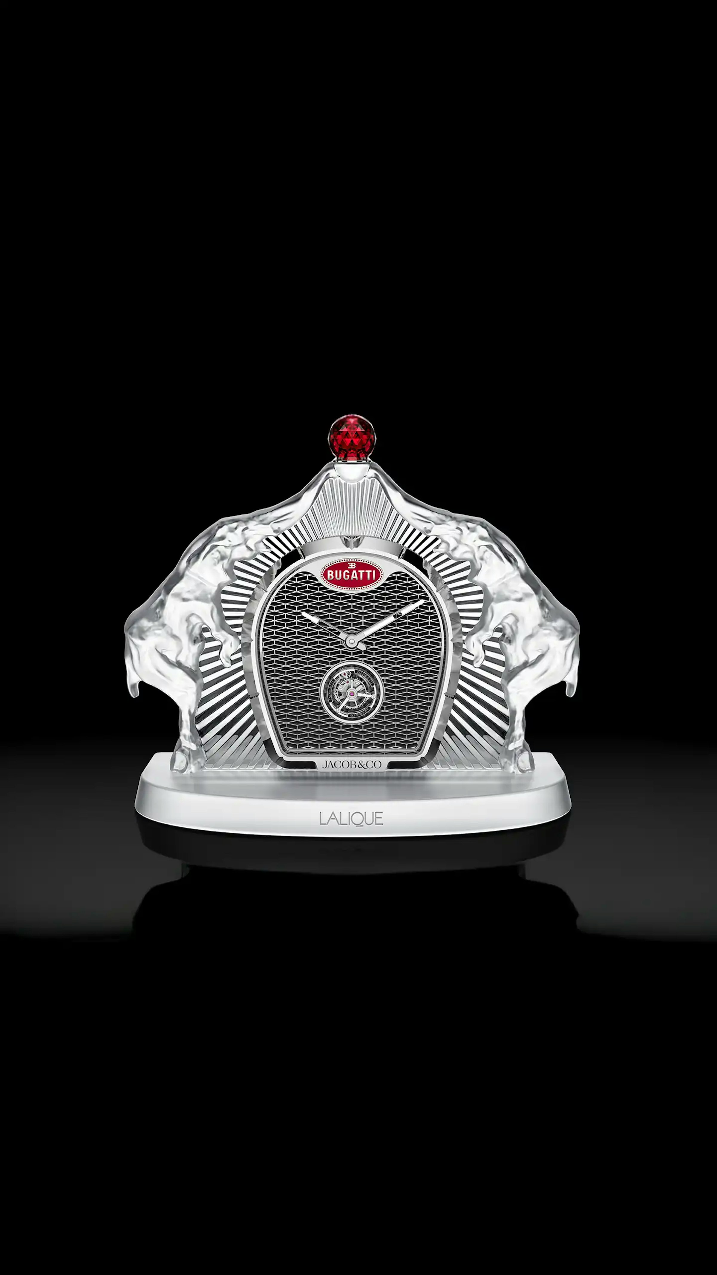 26 cm, Lalique crystal case. 30-mm, 288-facet, Jacob-cut red gemstone. Horseshoe grille-shaped dial. Vertical flying tourbillon. 189 components. 8-day power reserve.