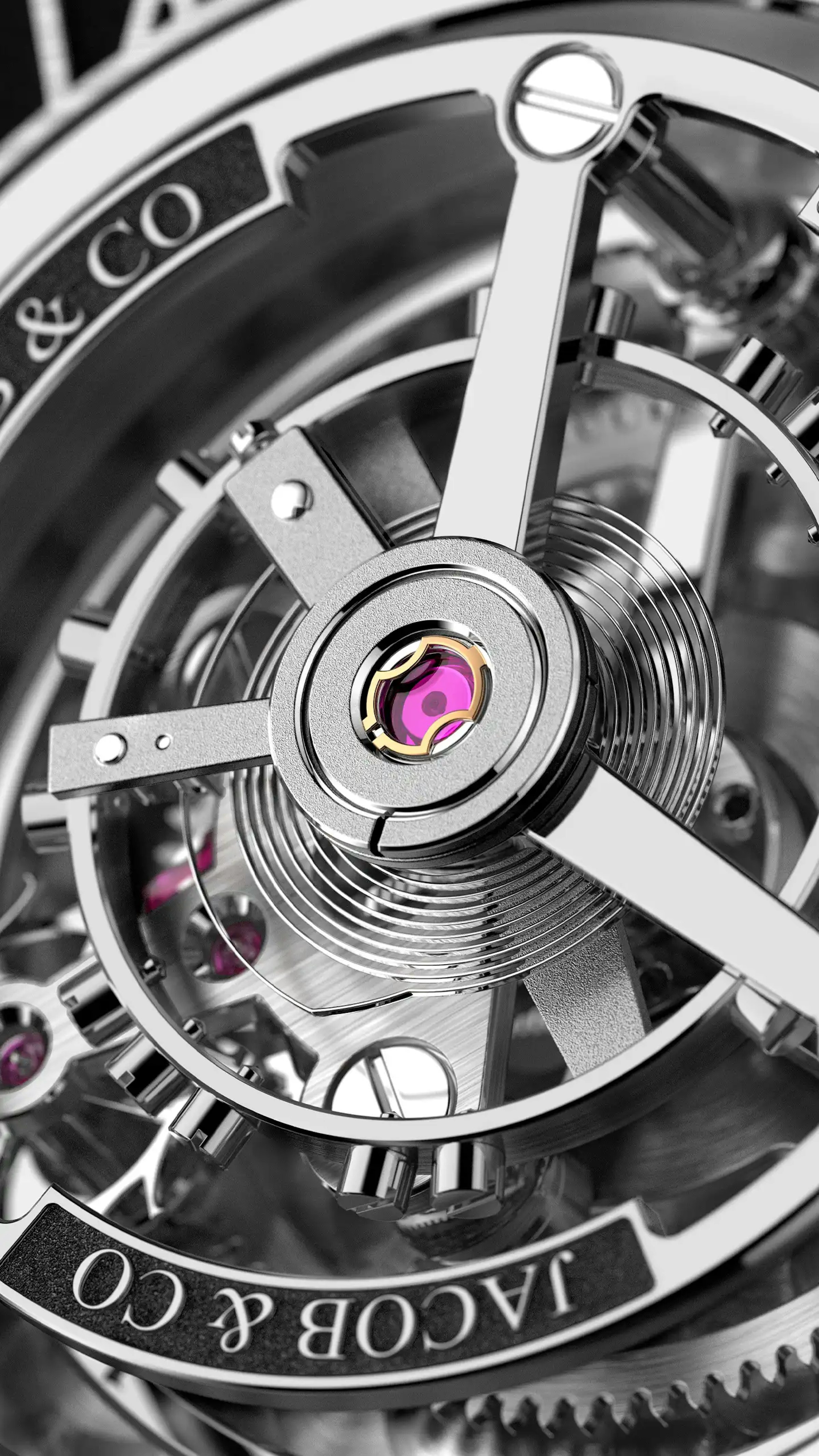 Gravity has a naturally negative impact on a movement's accuracy. By putting its escapement into a constant spin, the tourbillon counteracts this natural defect. That is even more true for movements that remain in vertical positions, such as pocket watches and even more so, clocks. It's for them that the tourbillon was invented. In a rare occurrence, Jacob & Co. fitted a tourbillon inside caliber JACAM58, and as it's a specialty of the brand, it's a flying tourbillon.