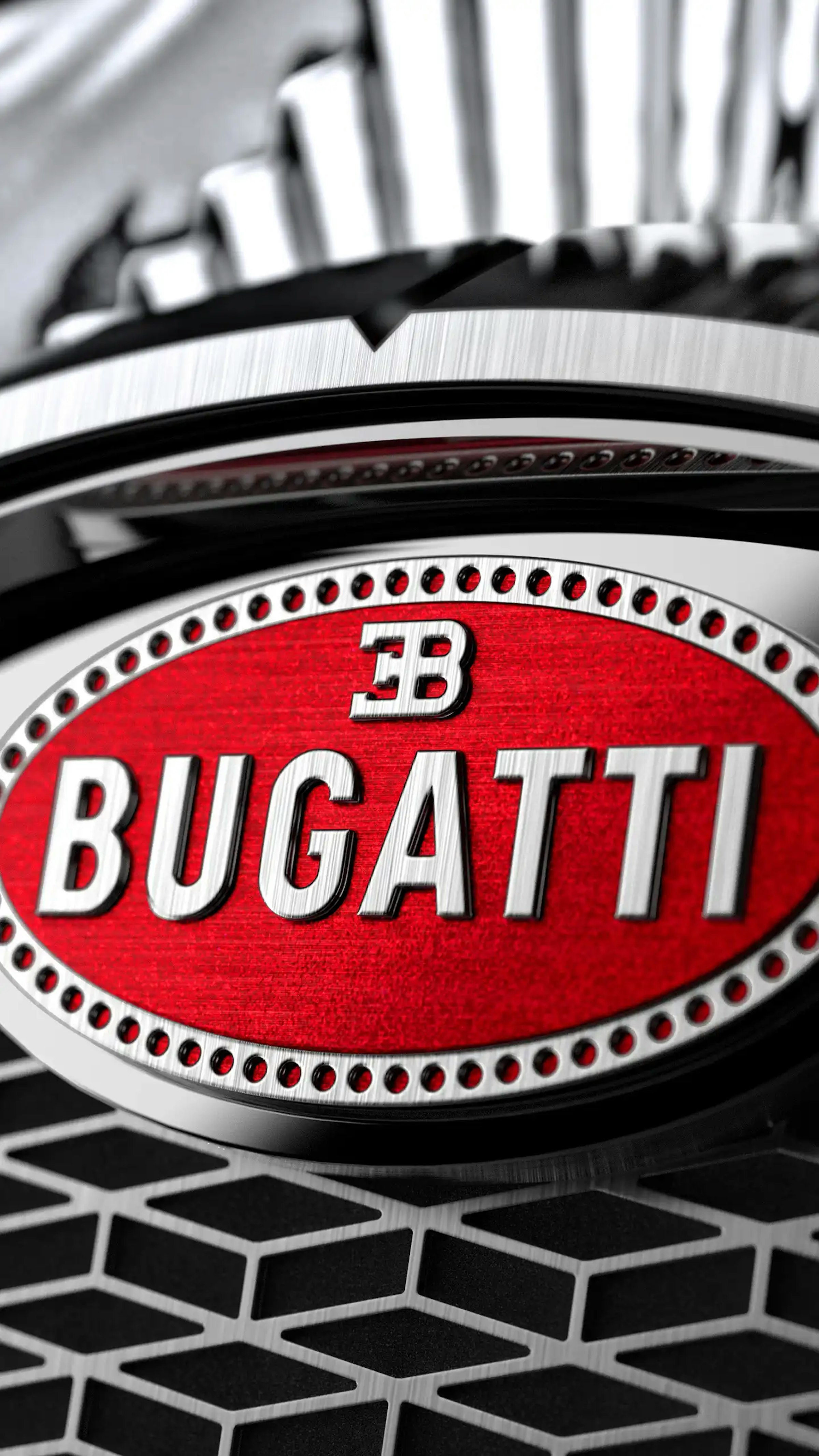 Sitting at the top of Bugatti Calandre is a beacon of the Jacob & Co. style. Red like the Bugatti logo, this large piece of crystal is also a nod to Jacob & Co.'s original calling, high jewelry. It showcases the gem-cutting expertise of the brand, as it is made with the signature, patented Jacob Cut : it has a total of 288 facets.