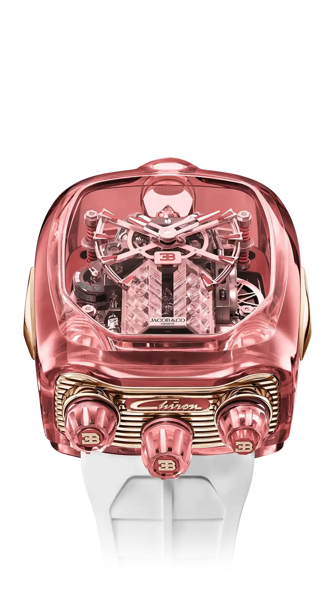 Jacob & Co. revisited the ancient tradition of automata with a W16 engine block animation. The large single block of transparent sapphire recreates the layout of the famed W16 Bugatti engine. At the press of a button, its 16 pistons fire up and down in their sapphire cylinders, driven by a single-block crankshaft. During the 15-second animation sequence, the Bugatti Chiron Tourbillon Sapphire Crystal comes to life.