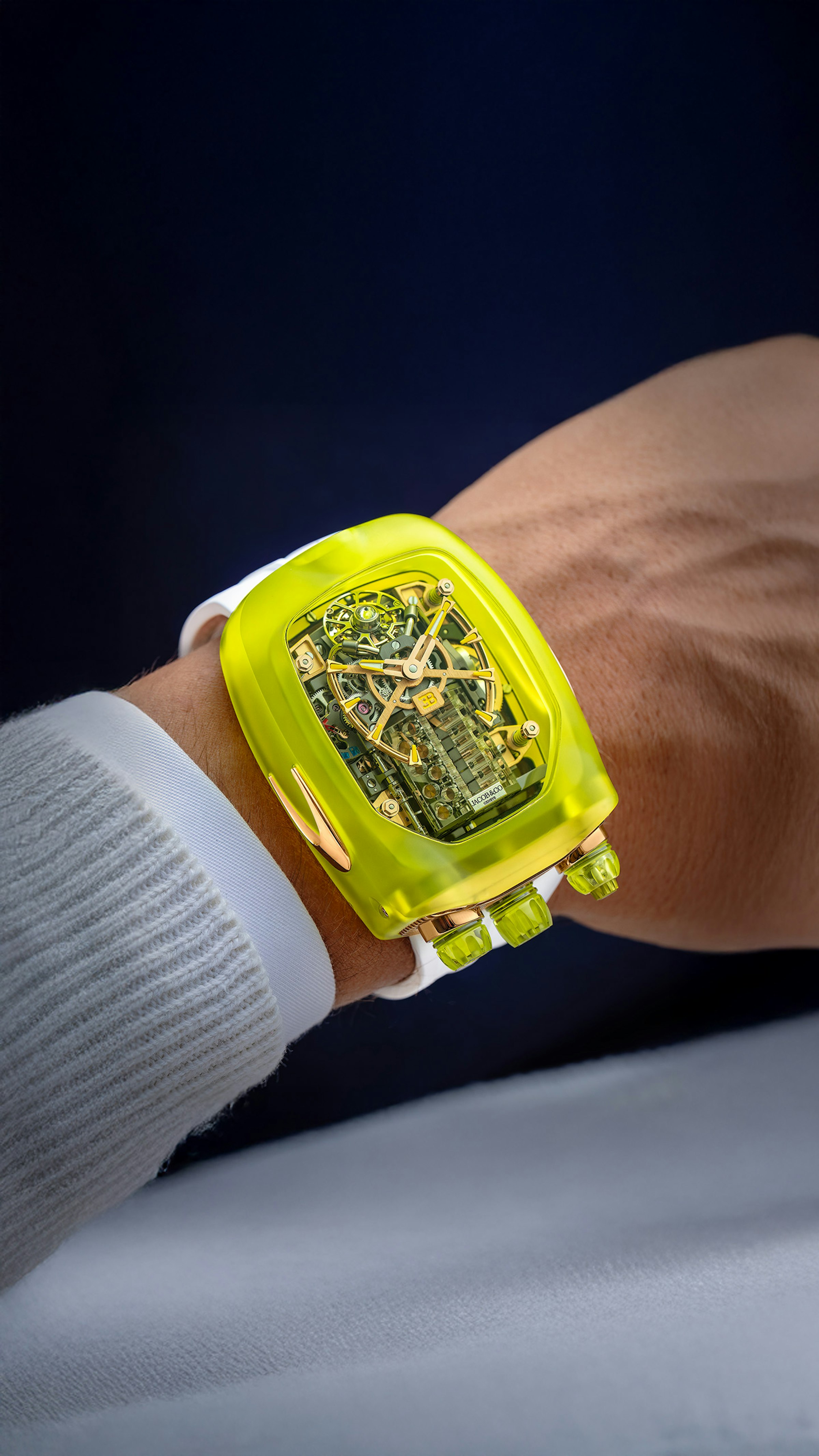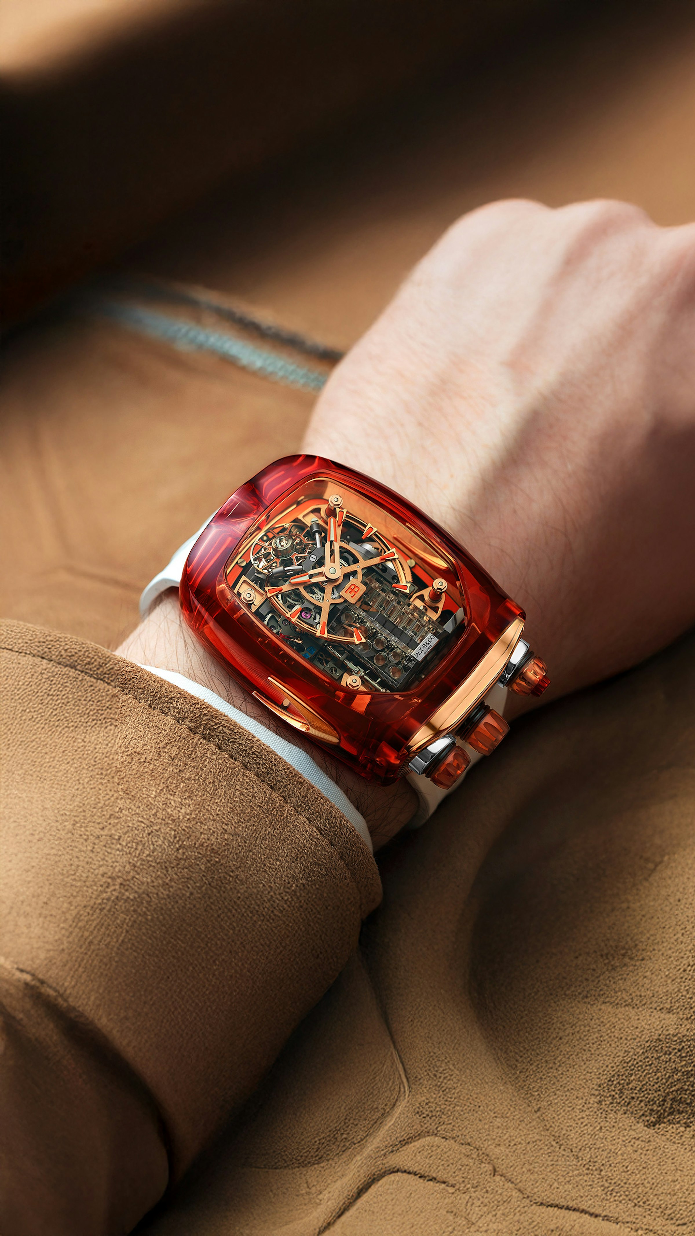 From a creative partnership to design inspiration. From the first stroke of a pencil through hundreds of iterations. A timepiece like no other comes to life. Shaped like a hypercar. Designed for elation. Transparent to the highest degree.