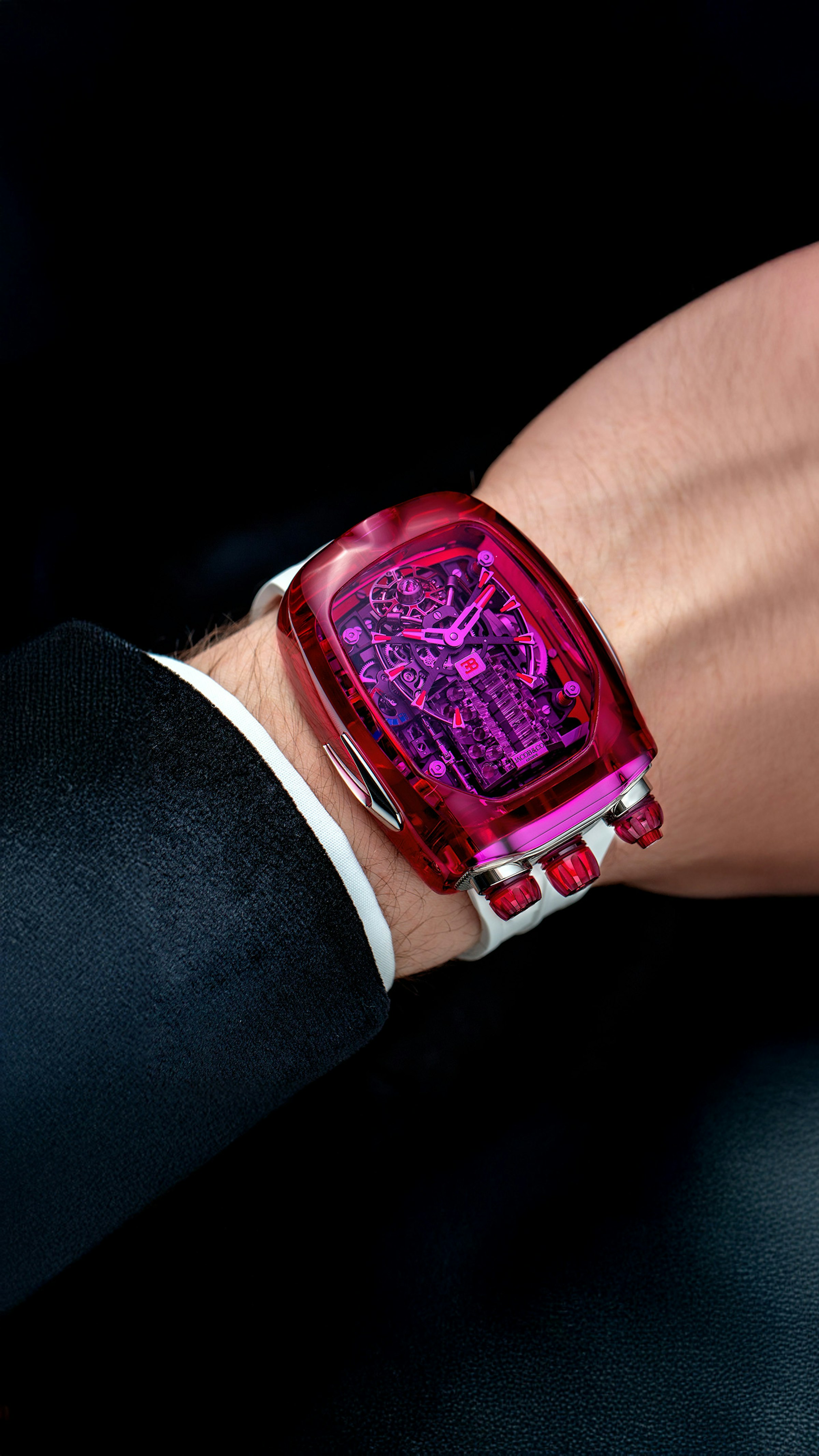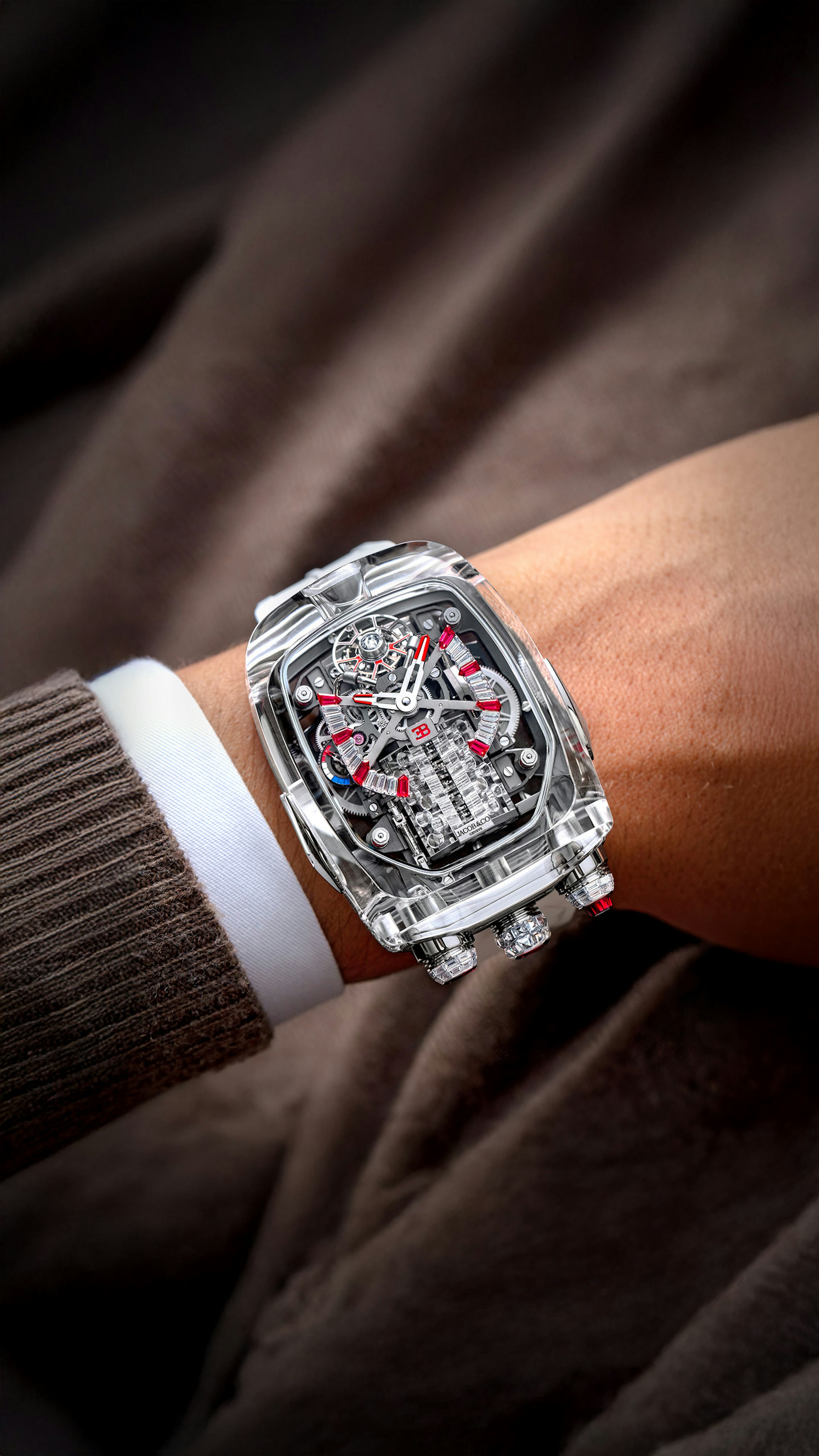 Case crafted out of solid transparent sapphire crystal. 578 components. One-minute flying tourbillon with 30° incline. W16 engine-block automaton. 60-hour power reserve.