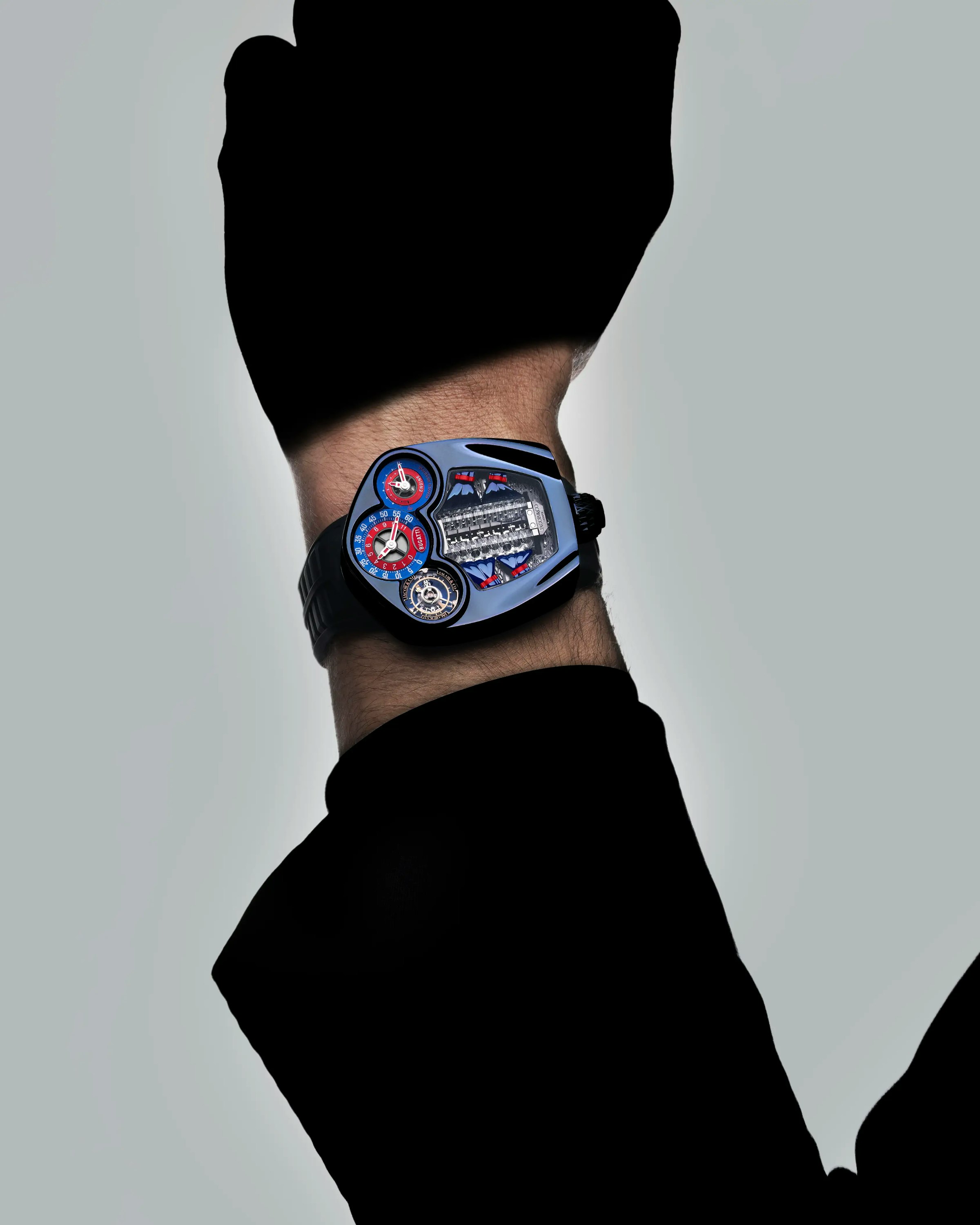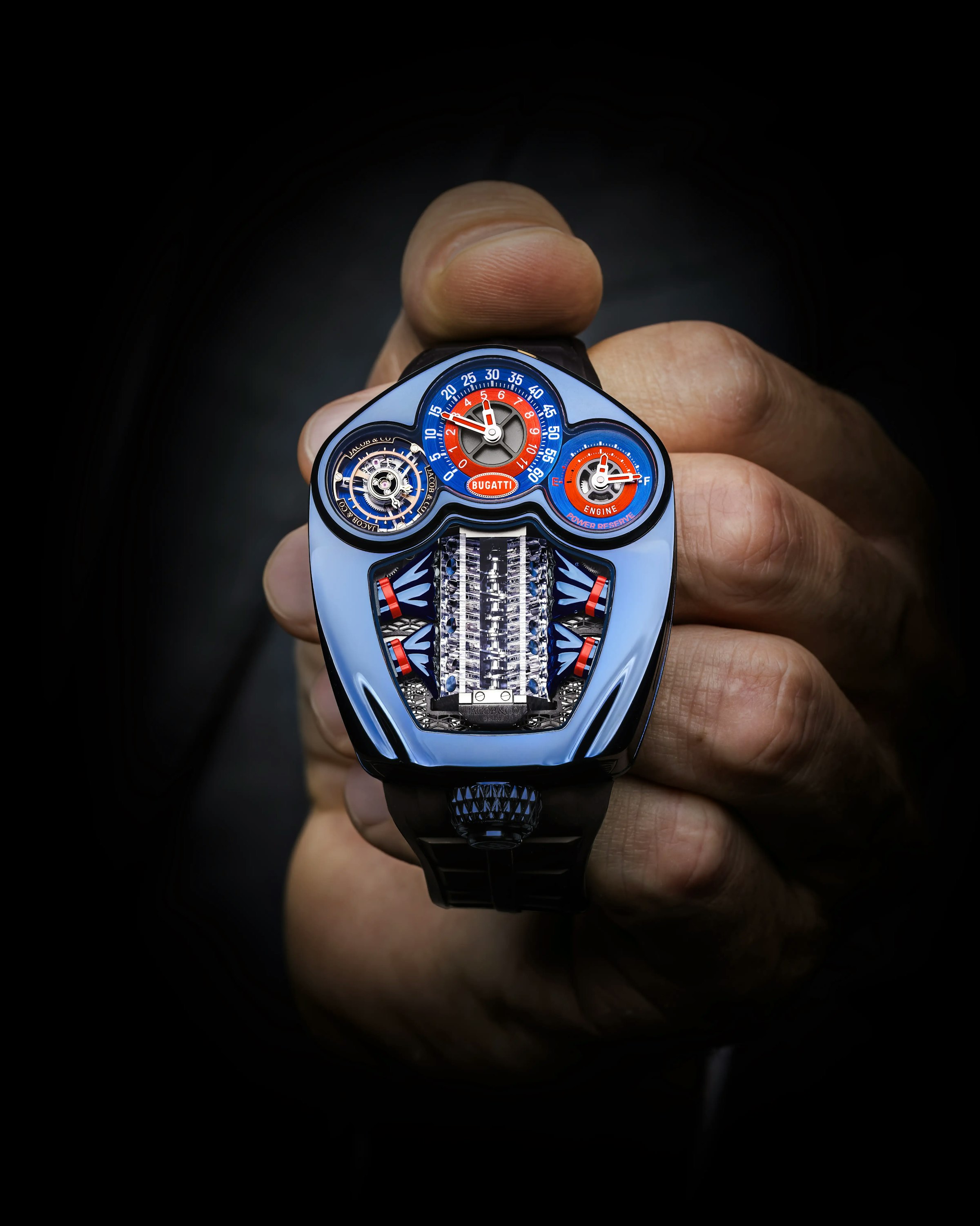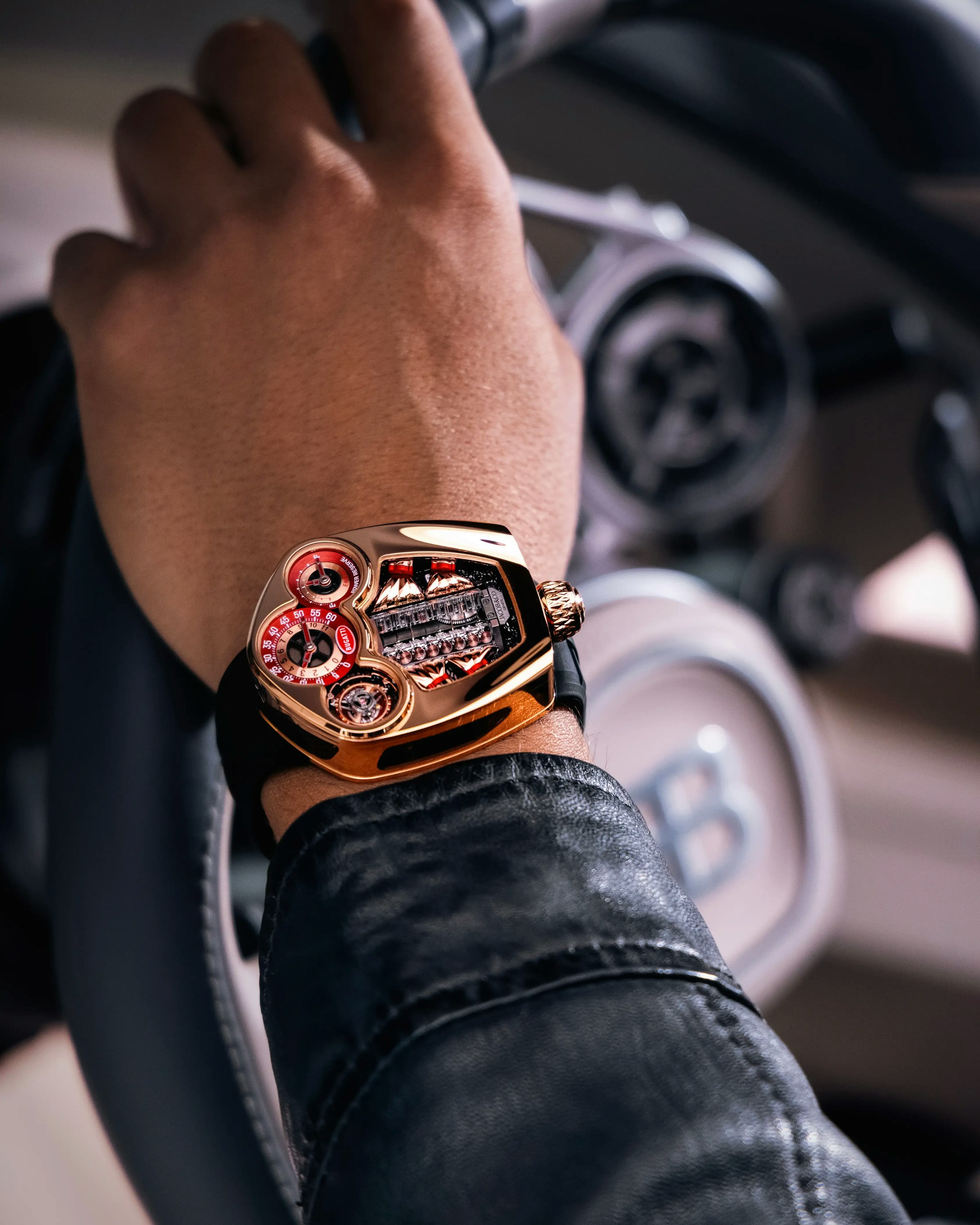 557 components. V16 engine block automaton. 30-second flying tourbillon. Off-centered jumping retrograde hours and retrograde minutes. Double power reserve indicator. 48-hour power reserve.