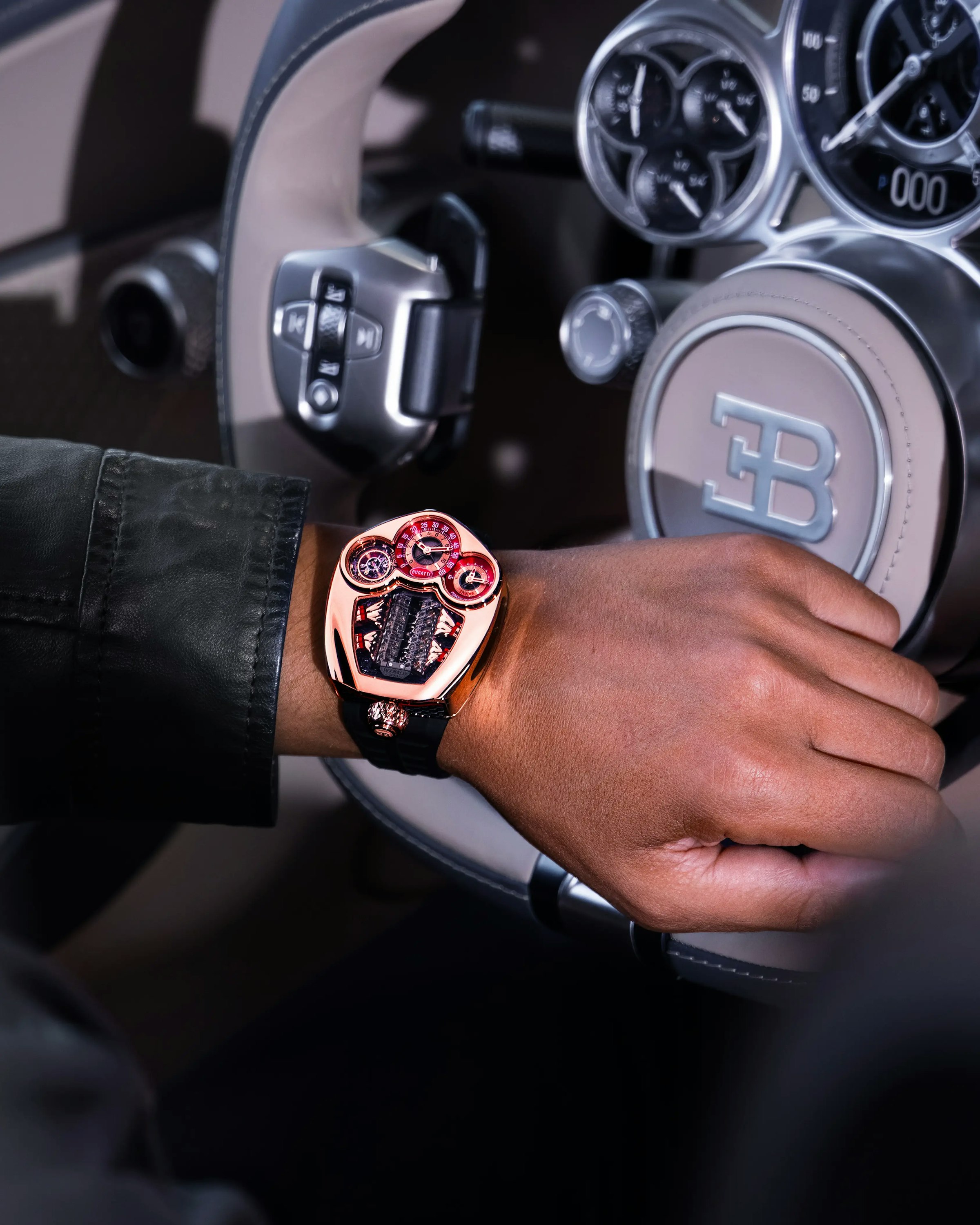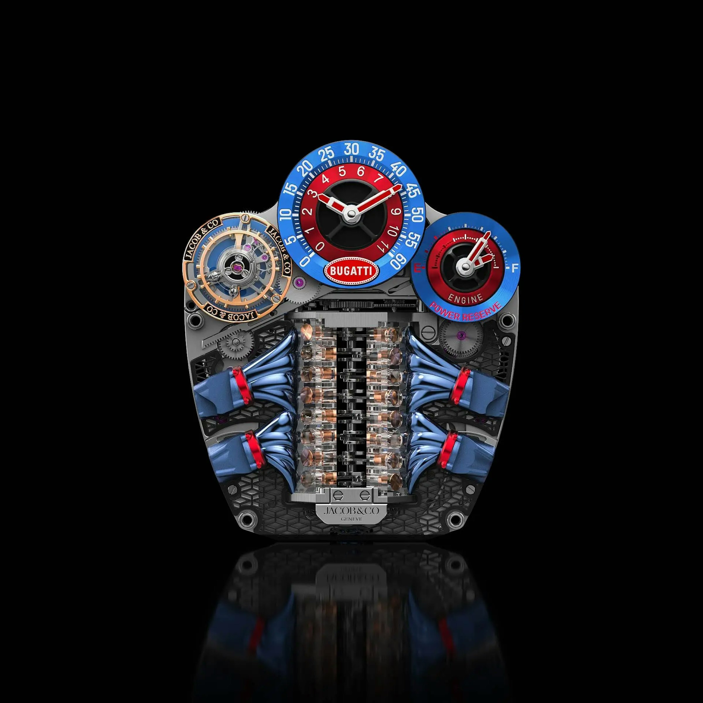 A unique feature in contemporary watchmaking, the Bugatti Tourbillon displays the power reserve of its automaton. The engine block automaton can execute an incredible 20 consecutive animation sequences on a single, full wind. The remaining autonomy is indicated by the smaller hand in the Power Reserve counter. Caliber JCAM55's overall power reserve of 48 hours is indicated by the larger, red hand in the same subdial.