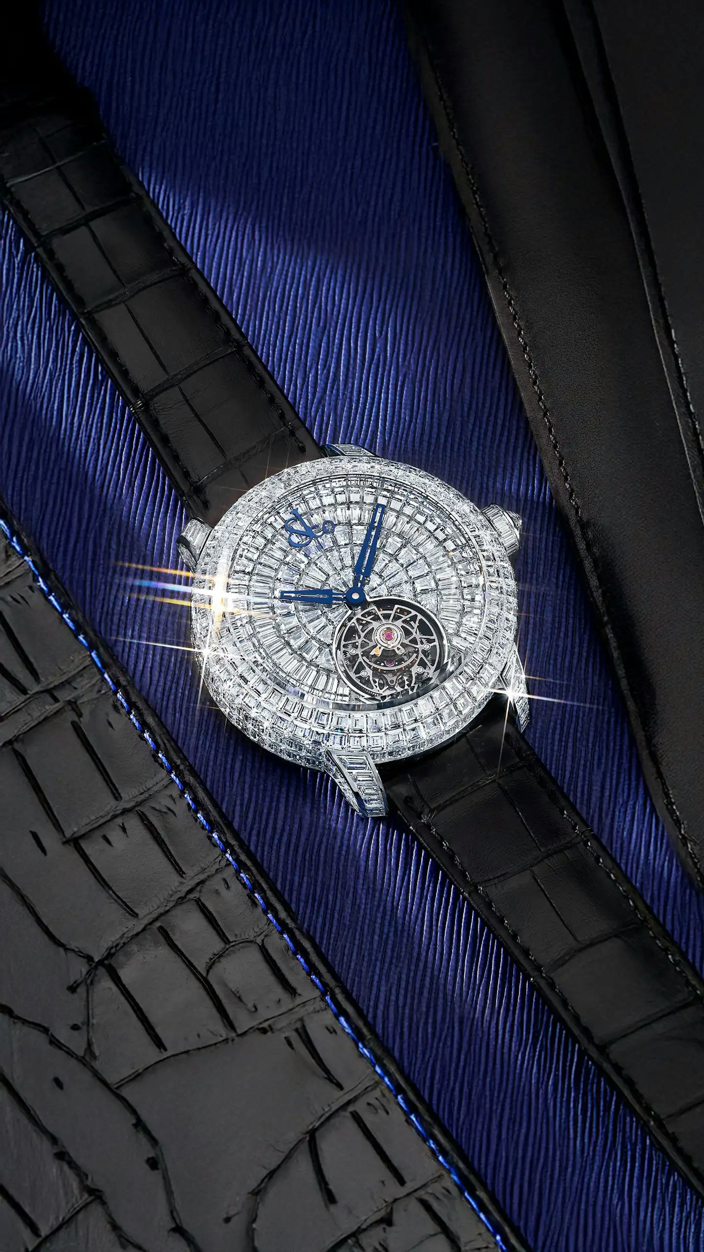 White gold case set with 224 baguette-cut white diamonds (23.65 ct.). Dial invisibly-set with 130 baguette-cut white diamonds (9.66 ct.). Self-winding movement set with 338 brilliant-cut diamonds (1.32 ct.). One-minute flying tourbillon. 216 components. 42-hour power reserve.