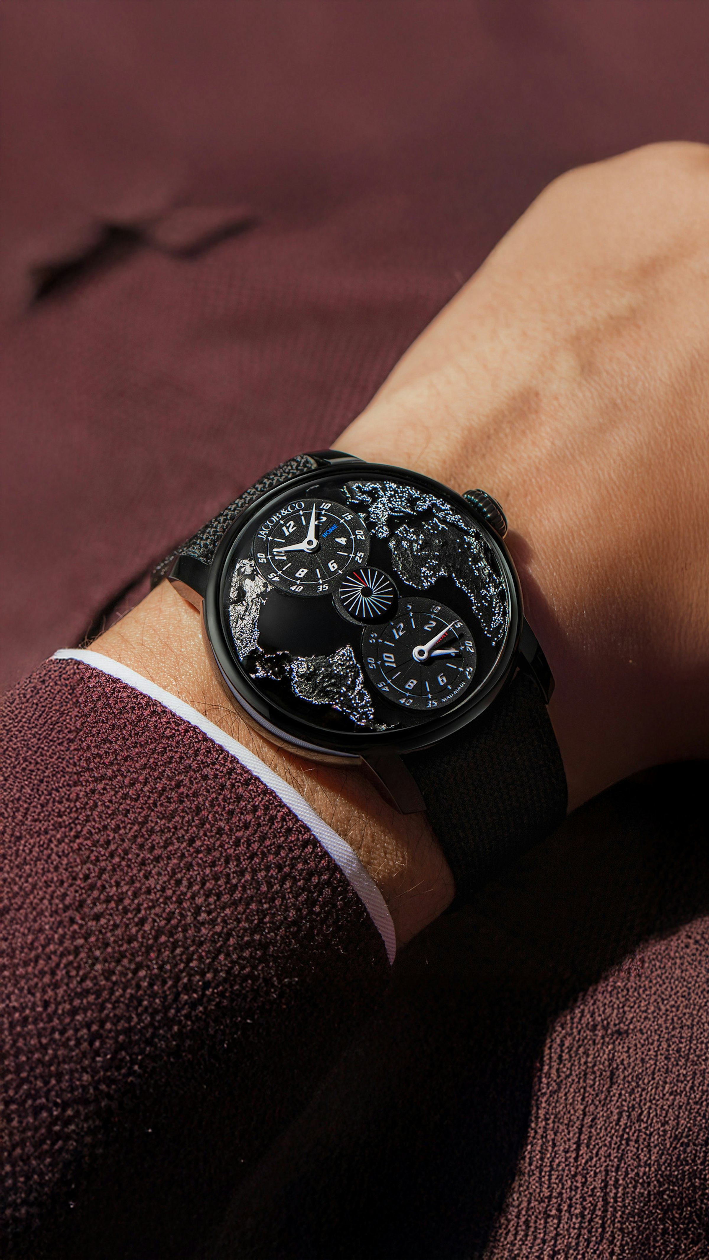 The World Is Yours Dual Time Zone MAD Paris houses a fine craft dial. Made of titanium, its surface is widely curved, requiring the hands to be tilted at a 12° angle. It's stamped with a sky view of the western hemisphere at night.