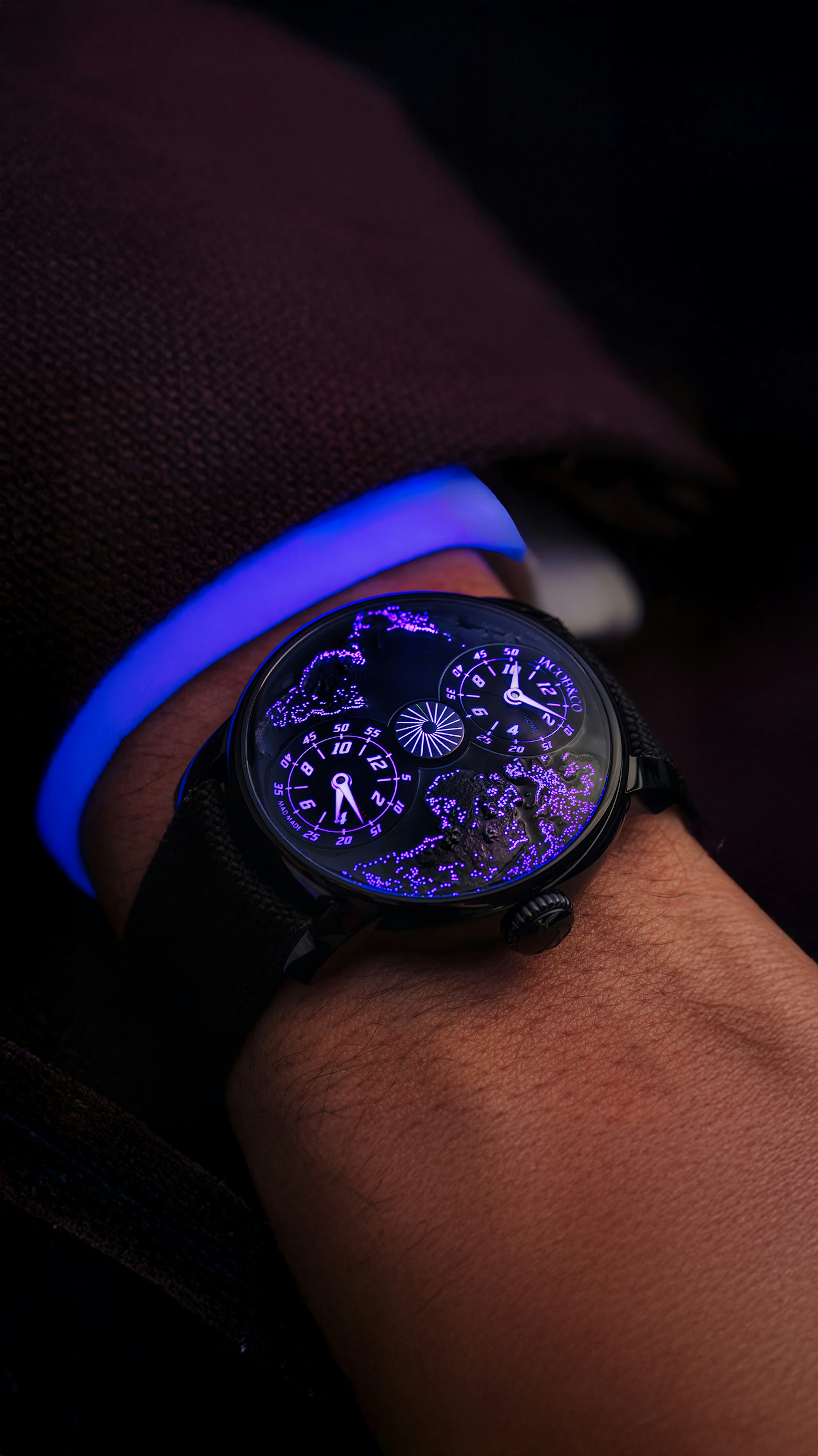 The dial of The World Is Yours Dual Time Zone MAD Paris is painstakingly hand crafted. The black titanium continents base is stamped, engraved and then filled with hundreds of SuperLumiNova dots. City lights, like the ones visible from an aircraft at night, appear when the lights are off. Both sub-dials emerge, with all their indications perfectly lit and readable.