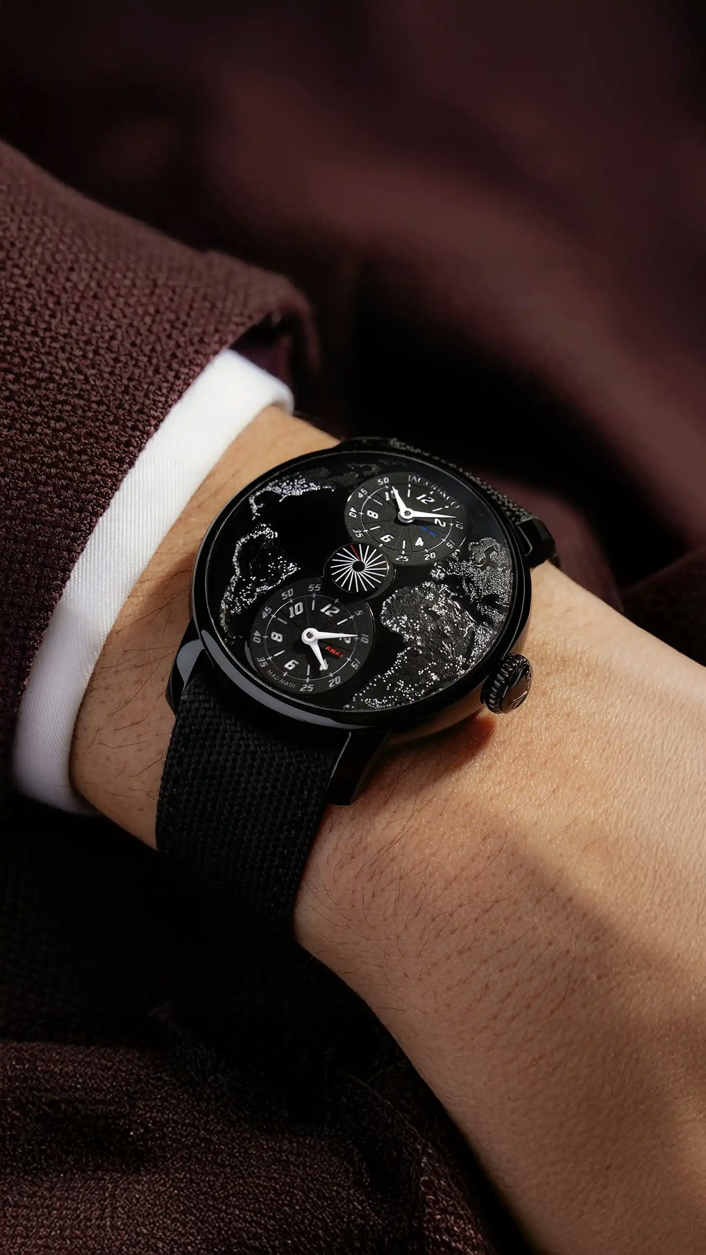 The World Is Yours Dual Time Zone MAD Paris houses a fine craft dial. Made of titanium, its surface is widely curved, requiring the hands to be tilted at a 12° angle. It's stamped with a sky view of the western hemisphere at night.