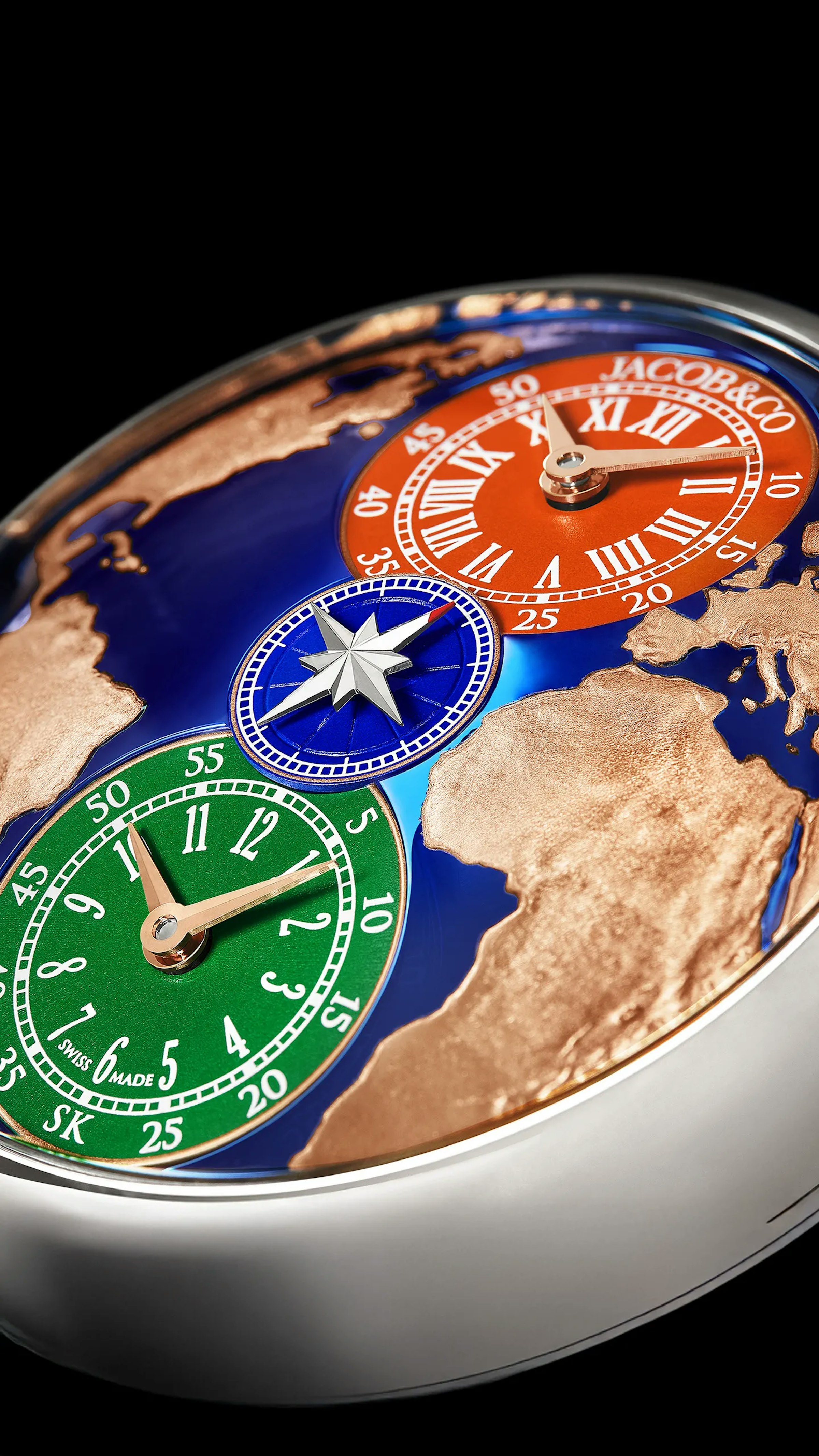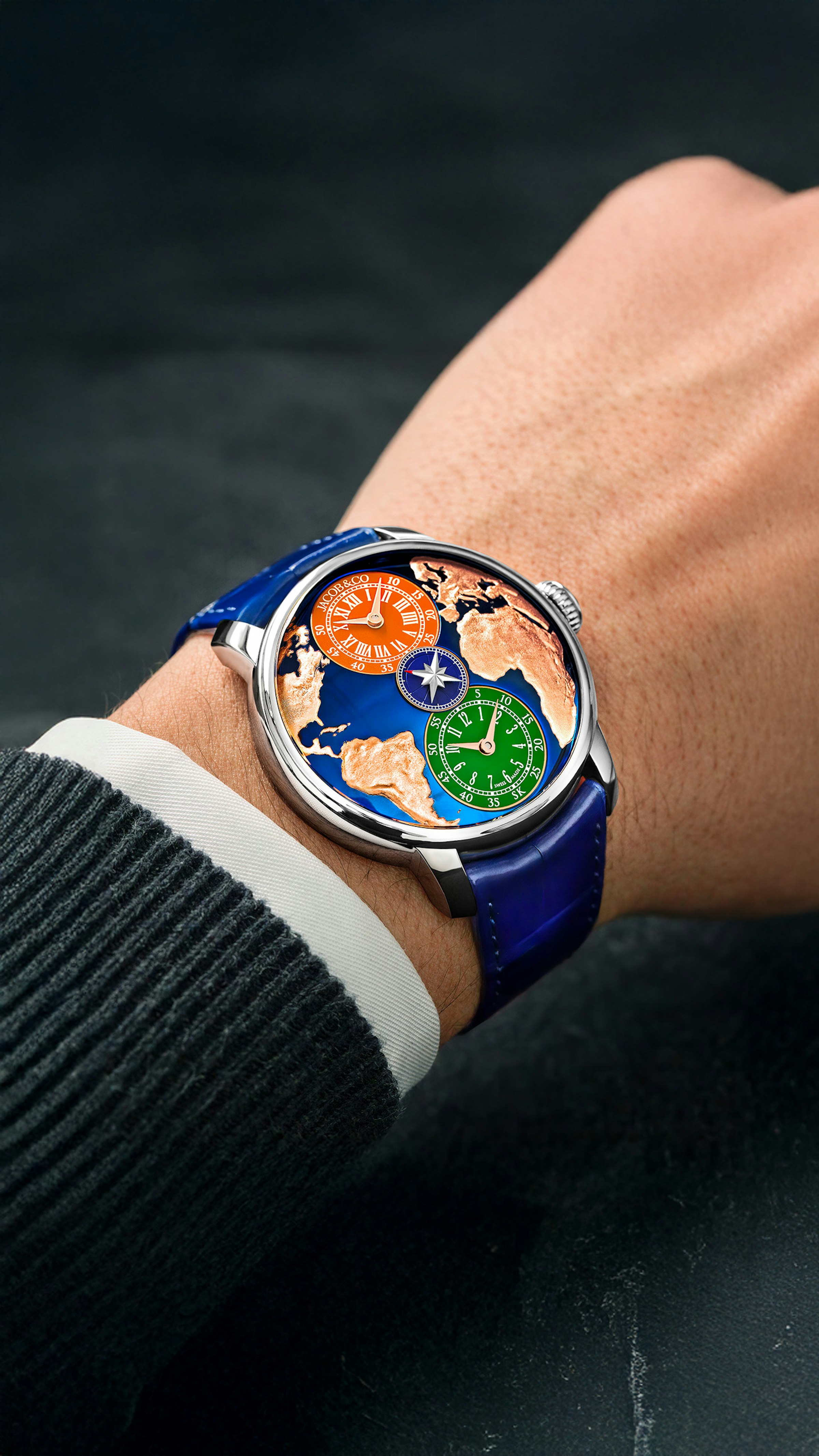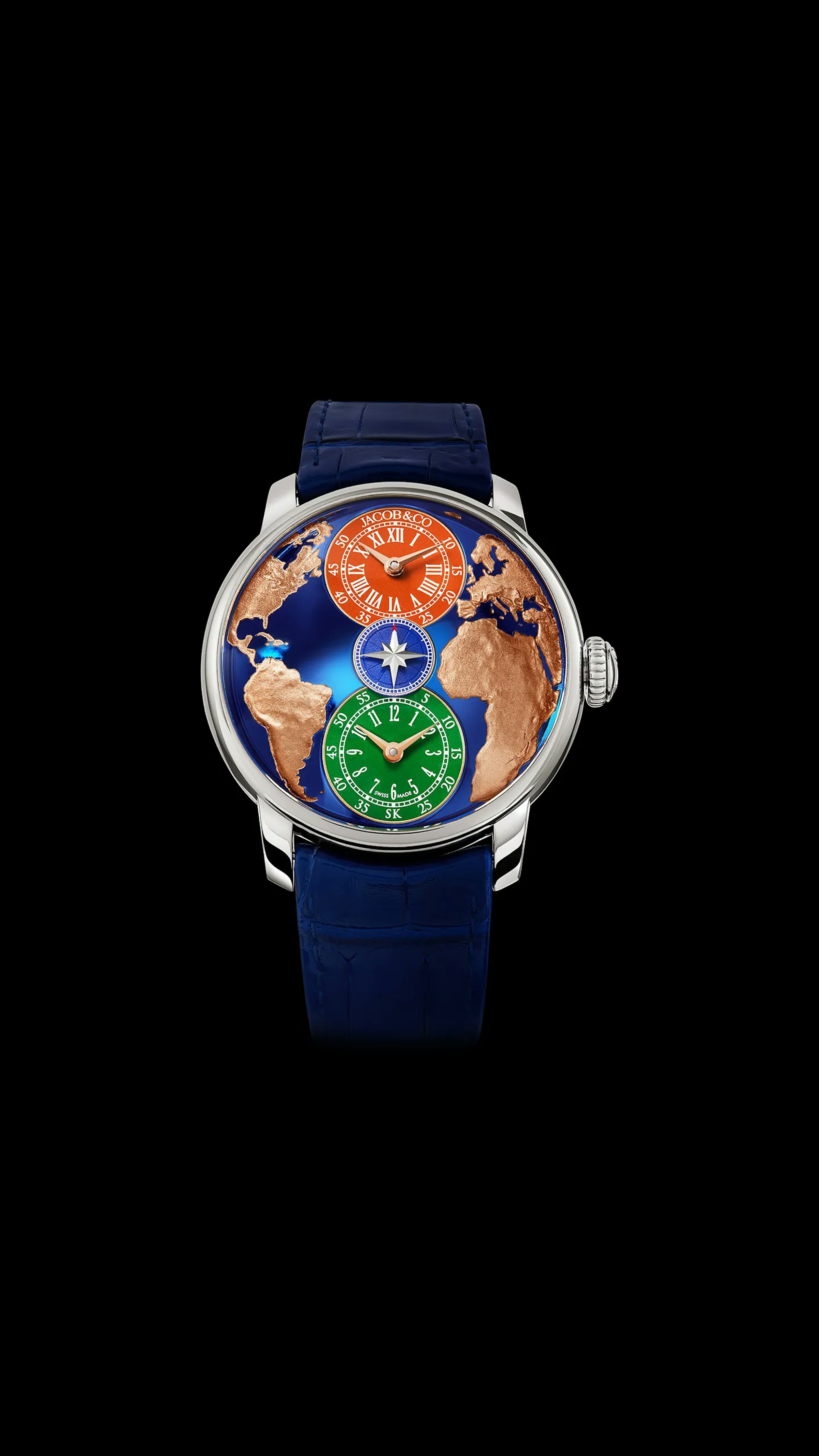 The World Is Yours Dual Time Zone Salman Khan houses a fine craft dial. Made of blue PVD titanium, its surface is widely curved, requiring the hands to be tilted at a 12° angle. It's stamped with a sky view of the western hemisphere. Seas are blue titanium surrounded by highly detailed continents.