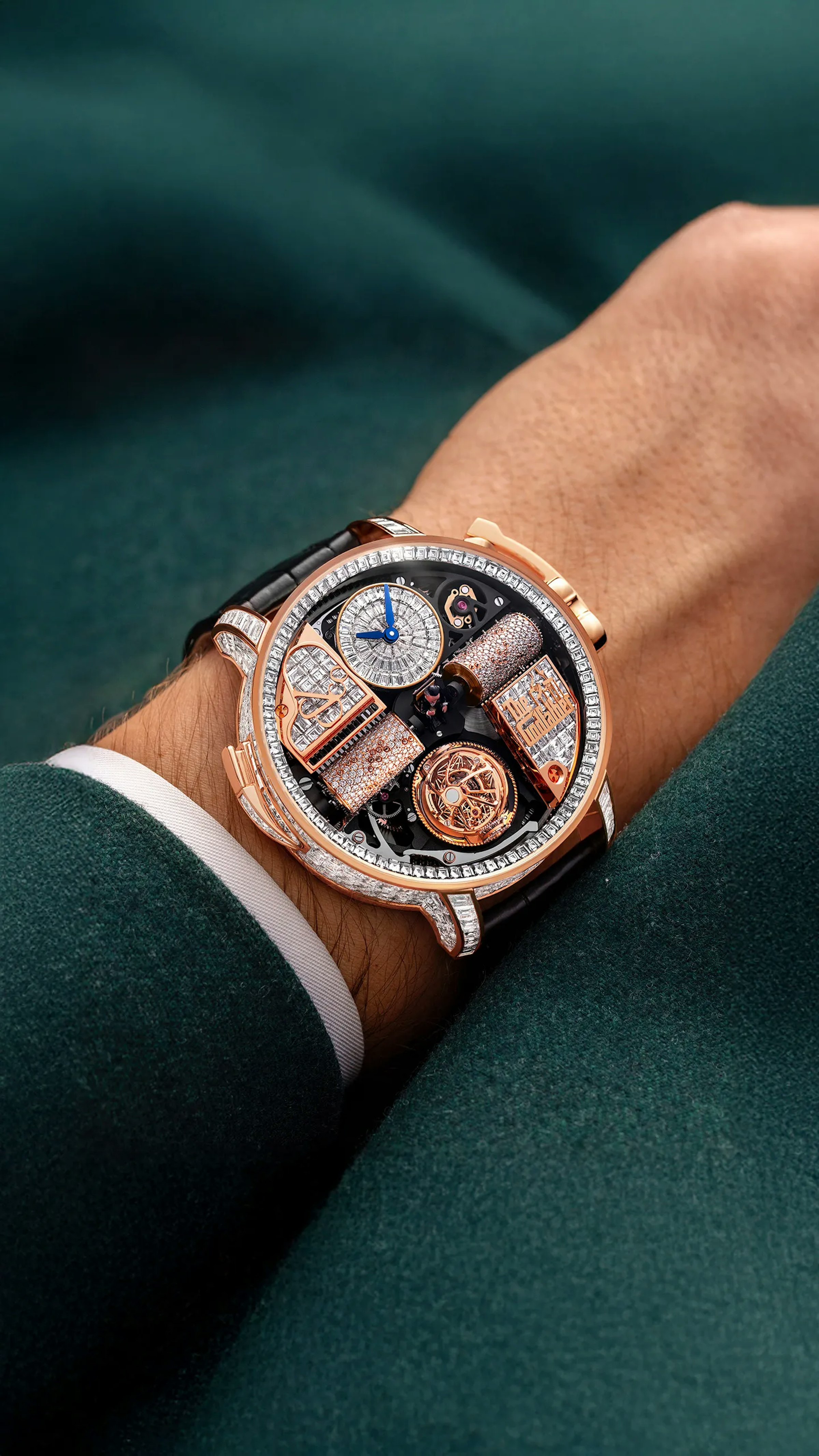 658 components. Music box playing 30-second The Godfather theme with rotating movement. Triple-axis flying tourbillon. Godfather-inspired decor. 50-hour power reserve. Case invisibly-set with 305 white baguette-cut diamonds (23.32 ct.). Décor and dial set with 124 white baguette-cut diamonds (3.62 ct.). Cylinders pavé-set with 666 brilliant-cut white diamonds (1.85 ct.).