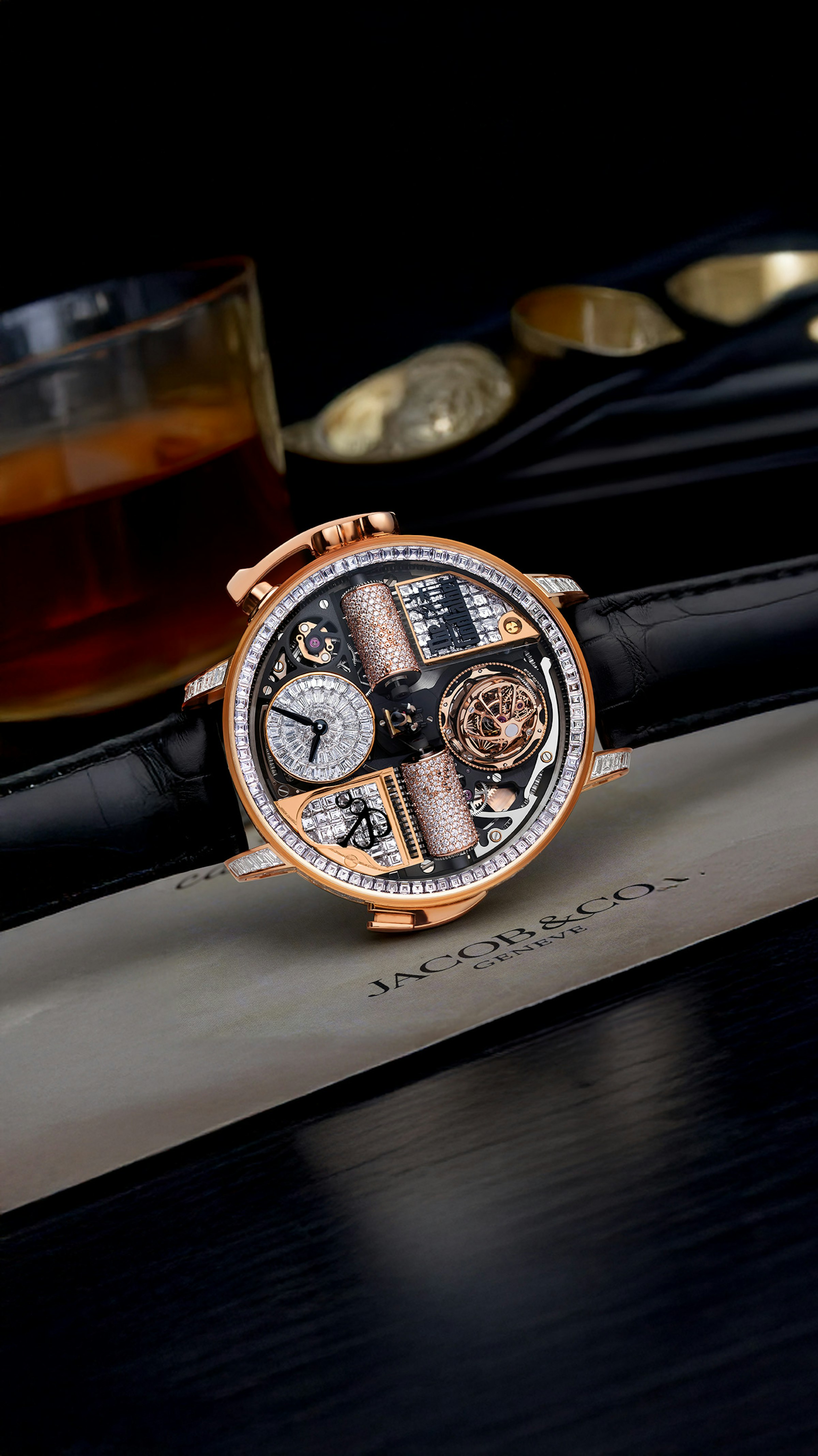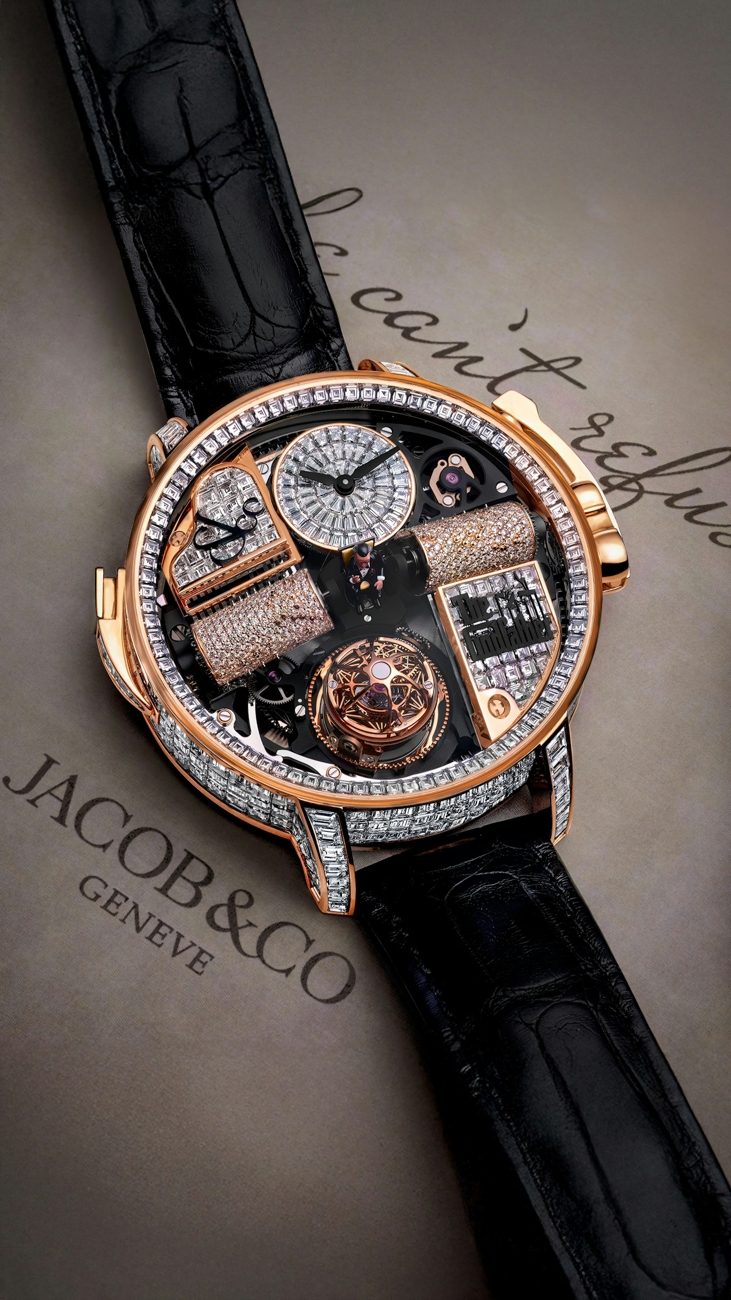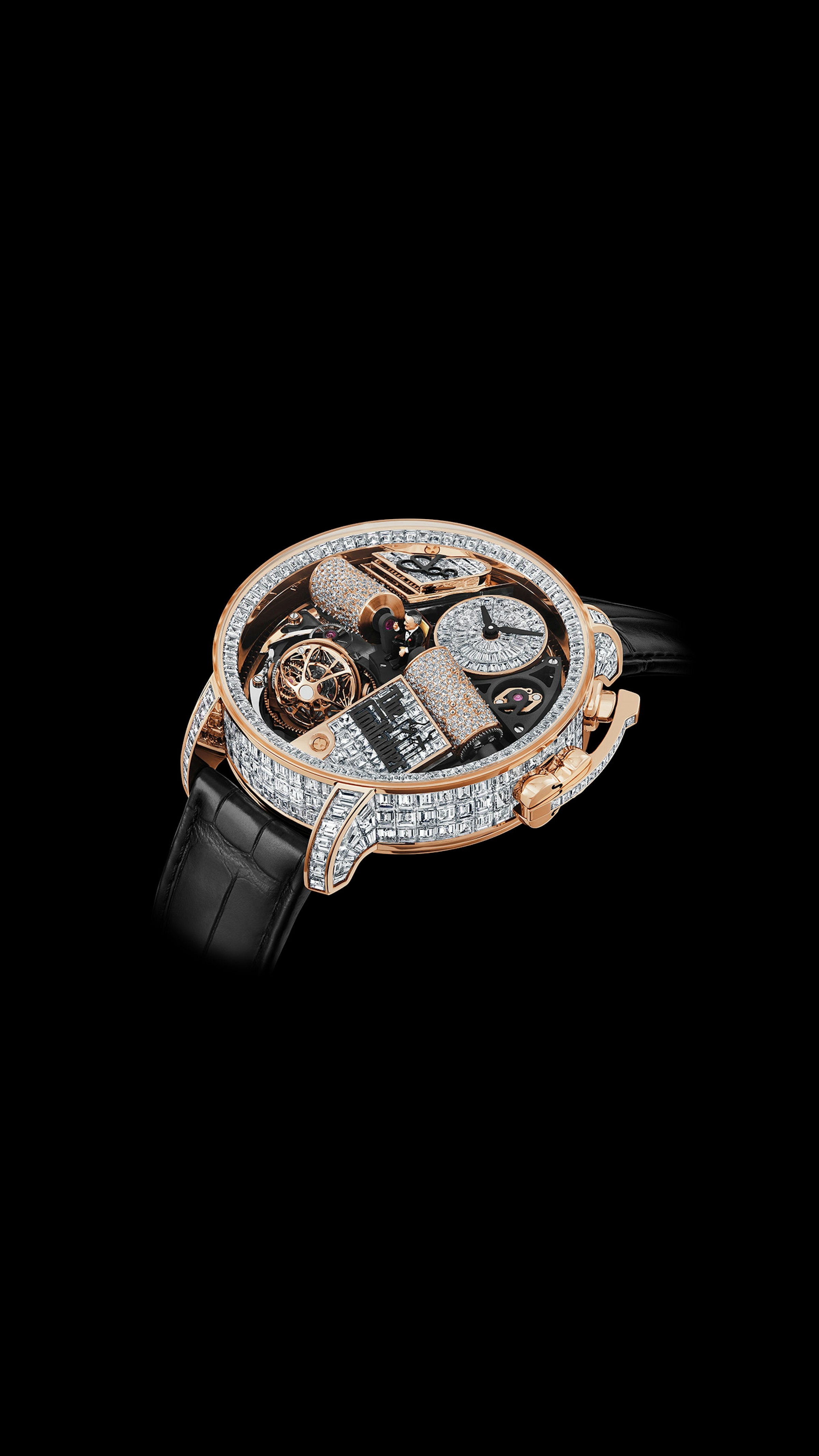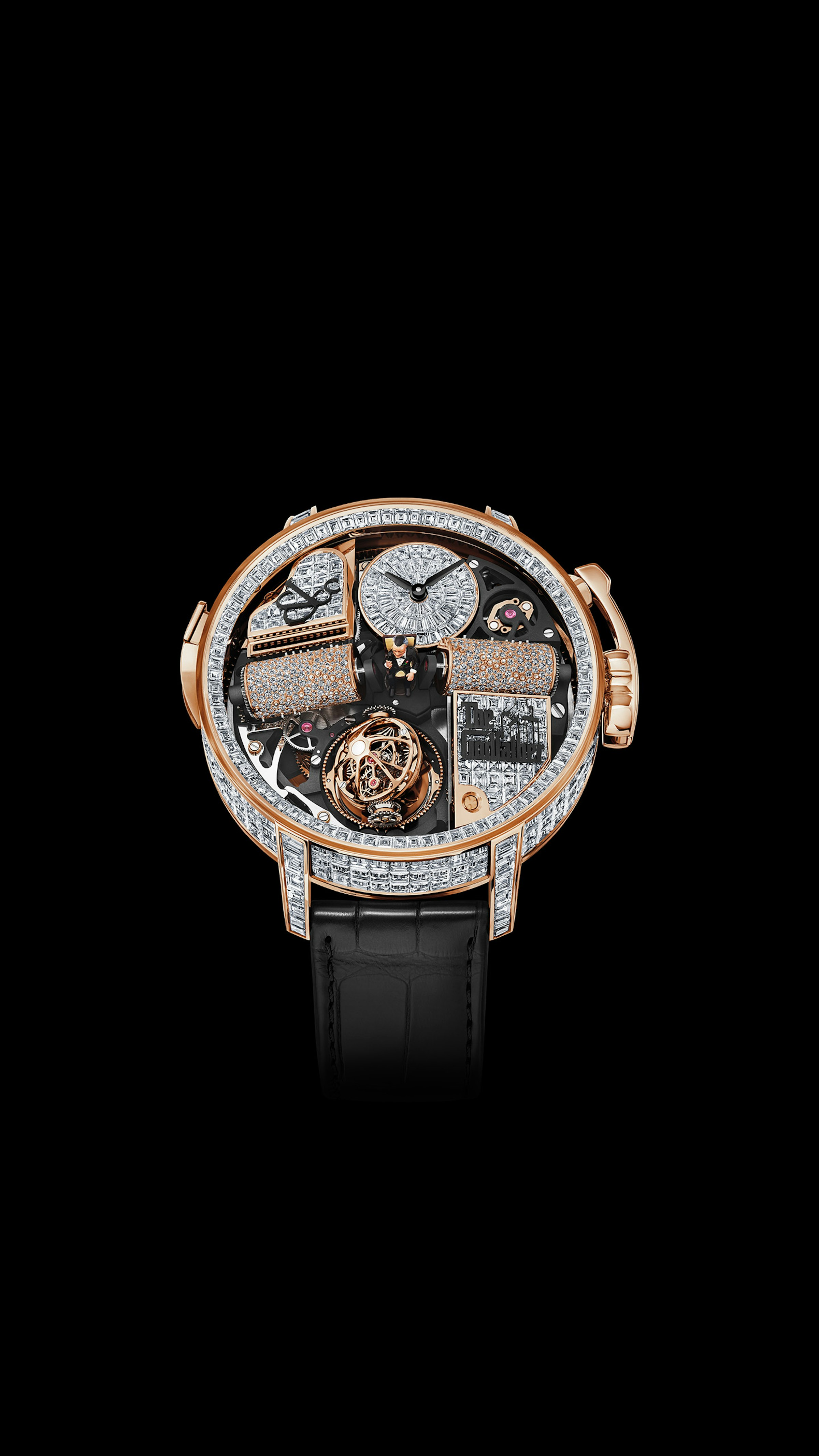 658 components. Music box playing 30-second The Godfather theme with rotating movement. Triple-axis flying tourbillon. Godfather-inspired decor. 50-hour power reserve. Case invisibly-set with 305 white baguette-cut diamonds (23.32 ct.). Décor and dial set with 124 white baguette-cut diamonds (3.62 ct.). Cylinders pavé-set with 666 brilliant-cut white diamonds (1.85 ct.).