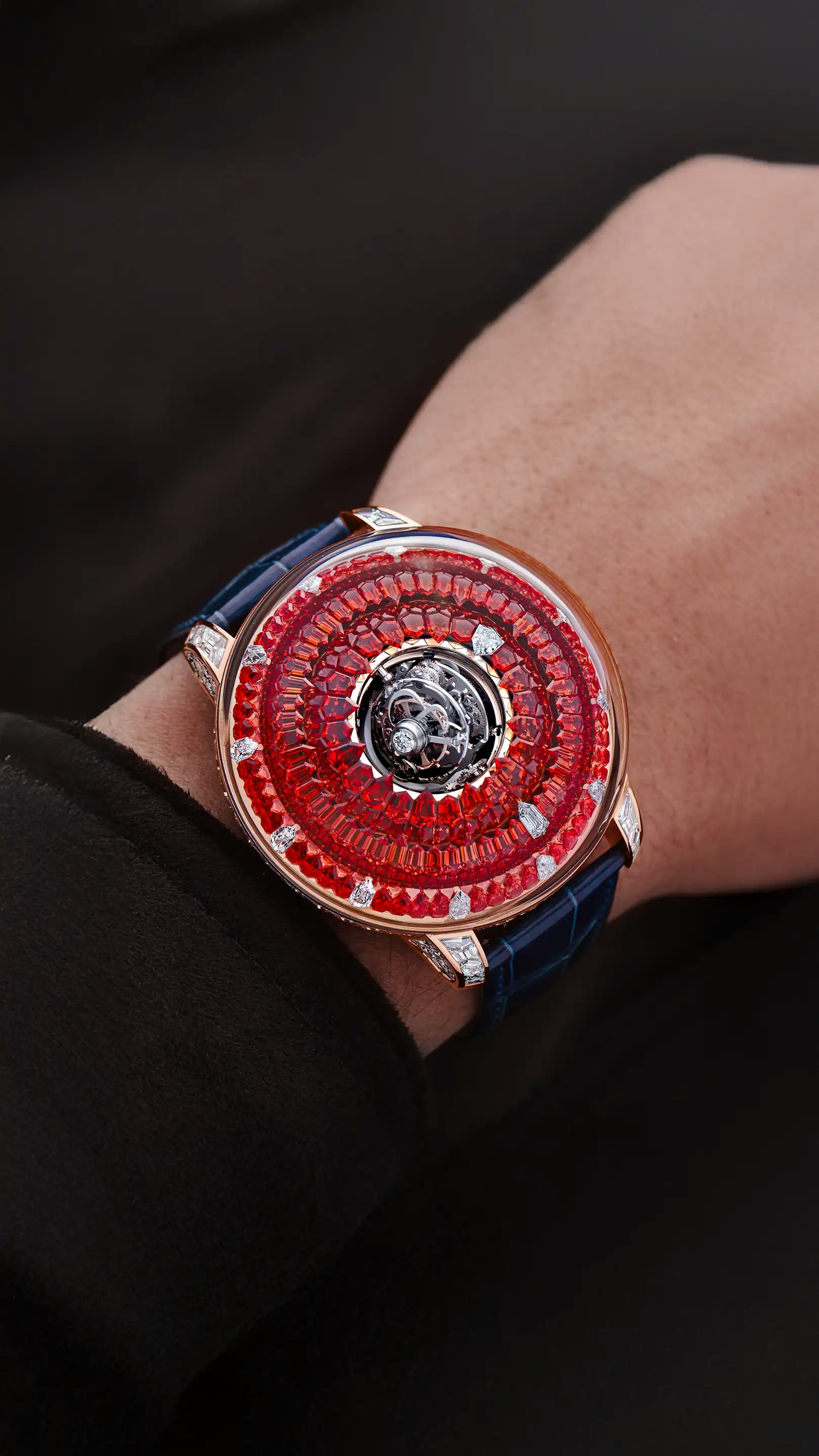 The mysterious part of The Mystery Tourbillon is that it doesn't have hands. Instead, hours and minutes are displayed on two concentric rings, lavishly set with overlapping gems. They tell time with the help of a single pointer, a gem of a different color than the others.