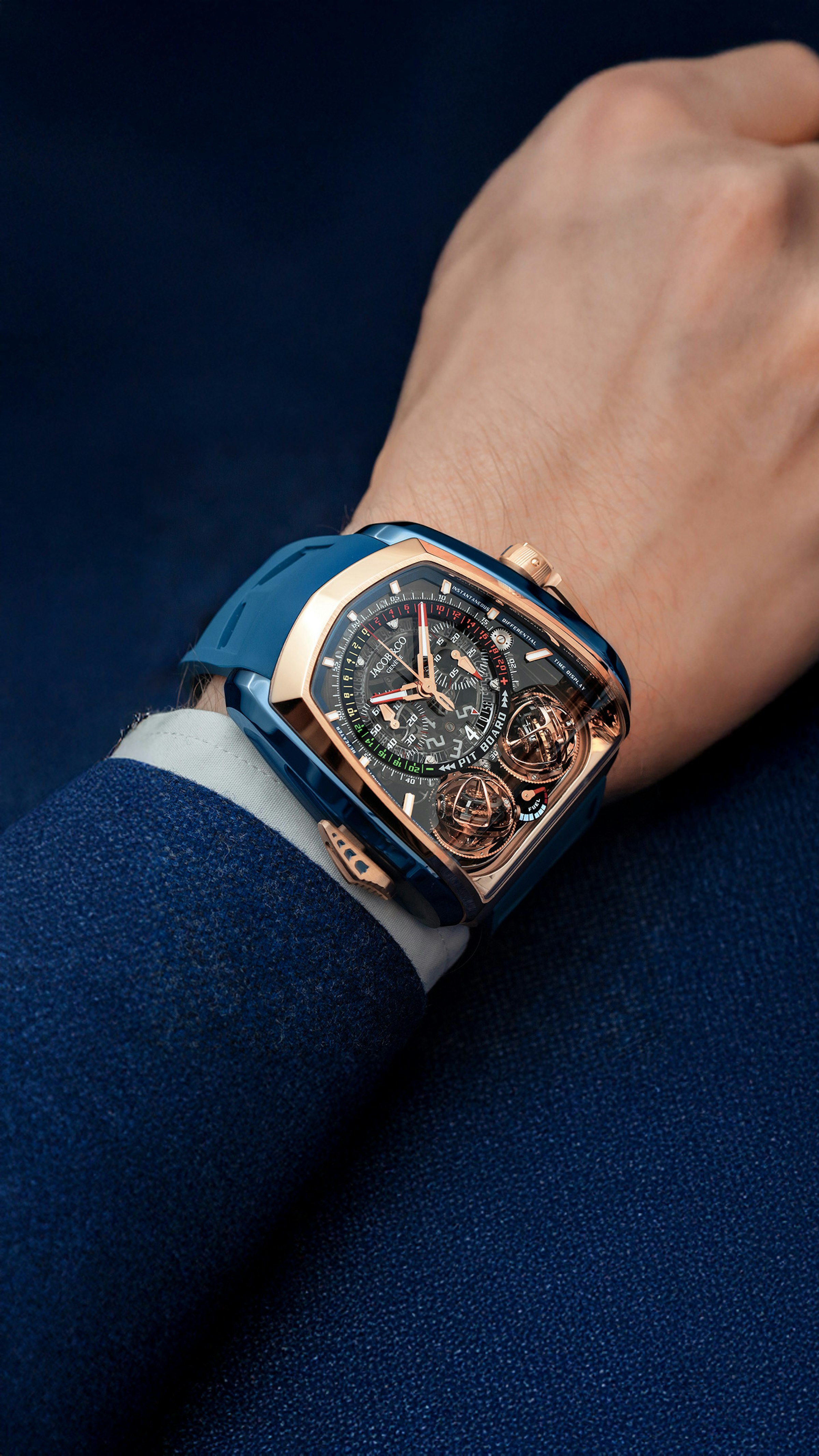 832 components. Twin flying triple-axis tourbillons. Decimal minute repeater. Monopusher chronograph with pit board reference time. Power reserve indicator. 48-hour power reserve.