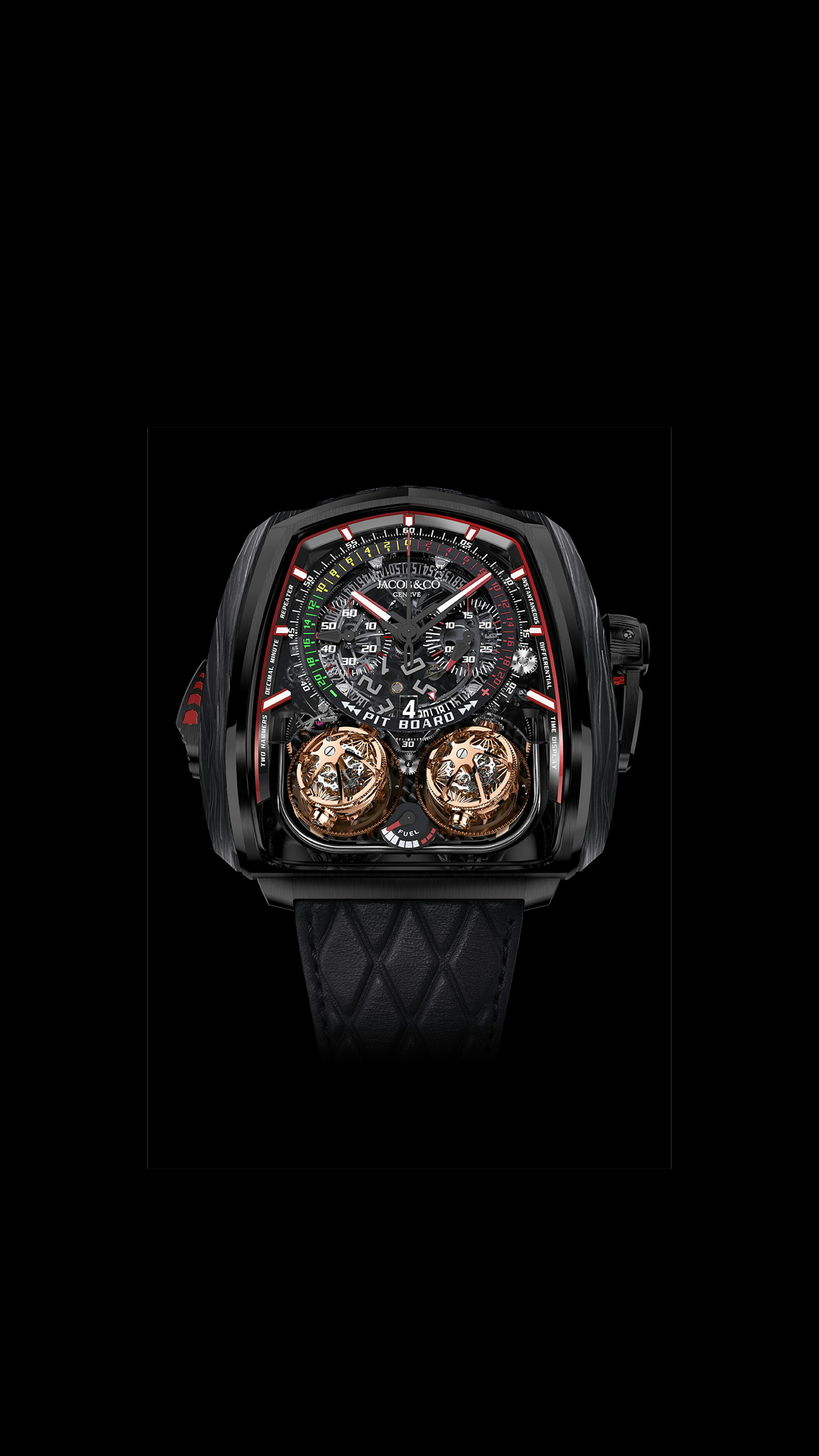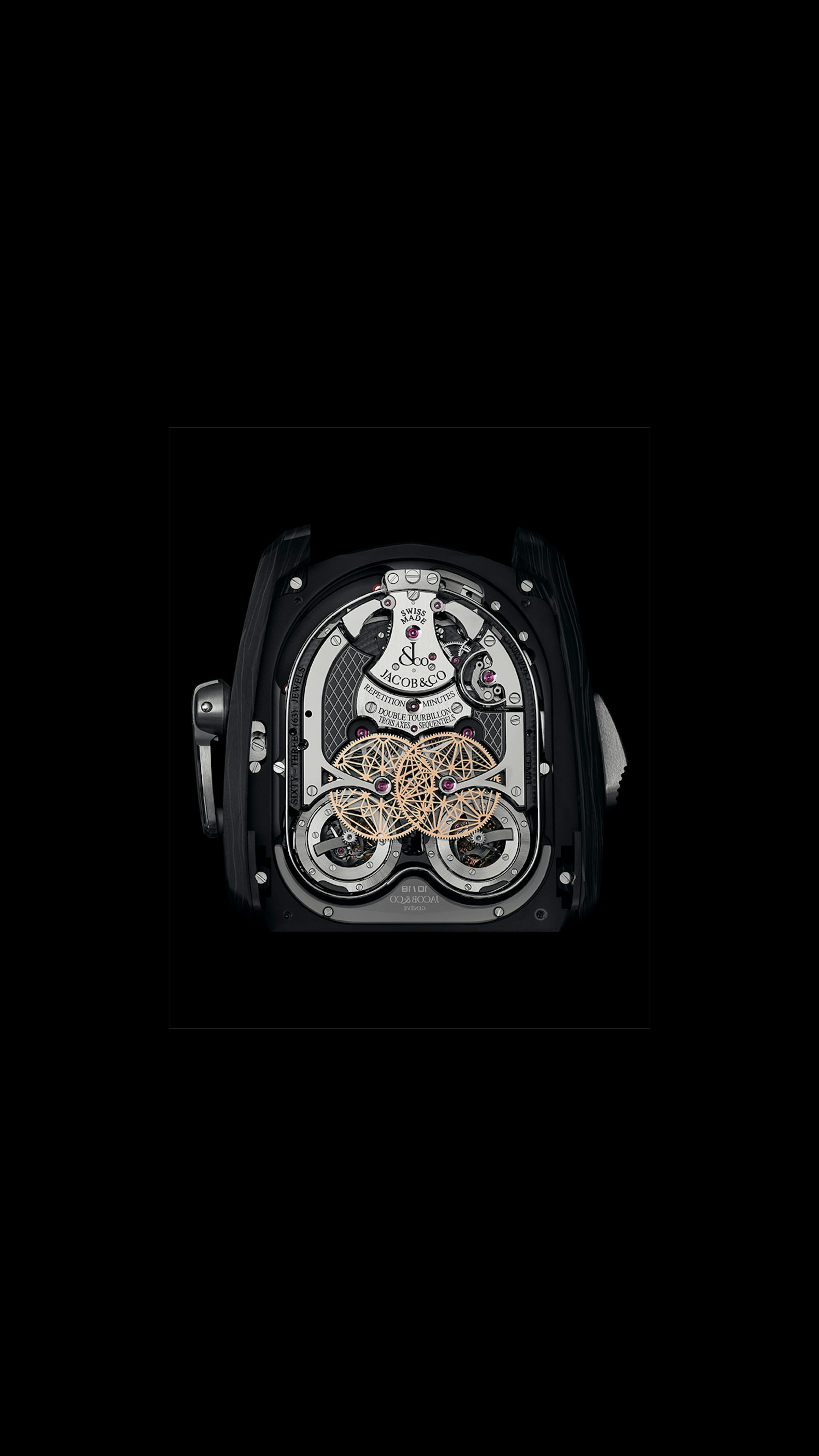 Using the slide on the left flank, the Twin Turbo Furious tells time with sound. The minute repeater function is one of the most prestigious ones. Jacob & Co. uses a rare type : a decimal minute repeater. Caliber JCFM05 strikes one note for each hour, one double note for every 10-minute segment (instead of quarters of hours) and a different note for each minute after the 10-minute segments. To enhance this sound, Jacob & Co. used another rare feature : Cathedral gongs. The metal rods bent around the movement are almost twice as long as traditional ones. They produce a deeper, longer, more intense sound.