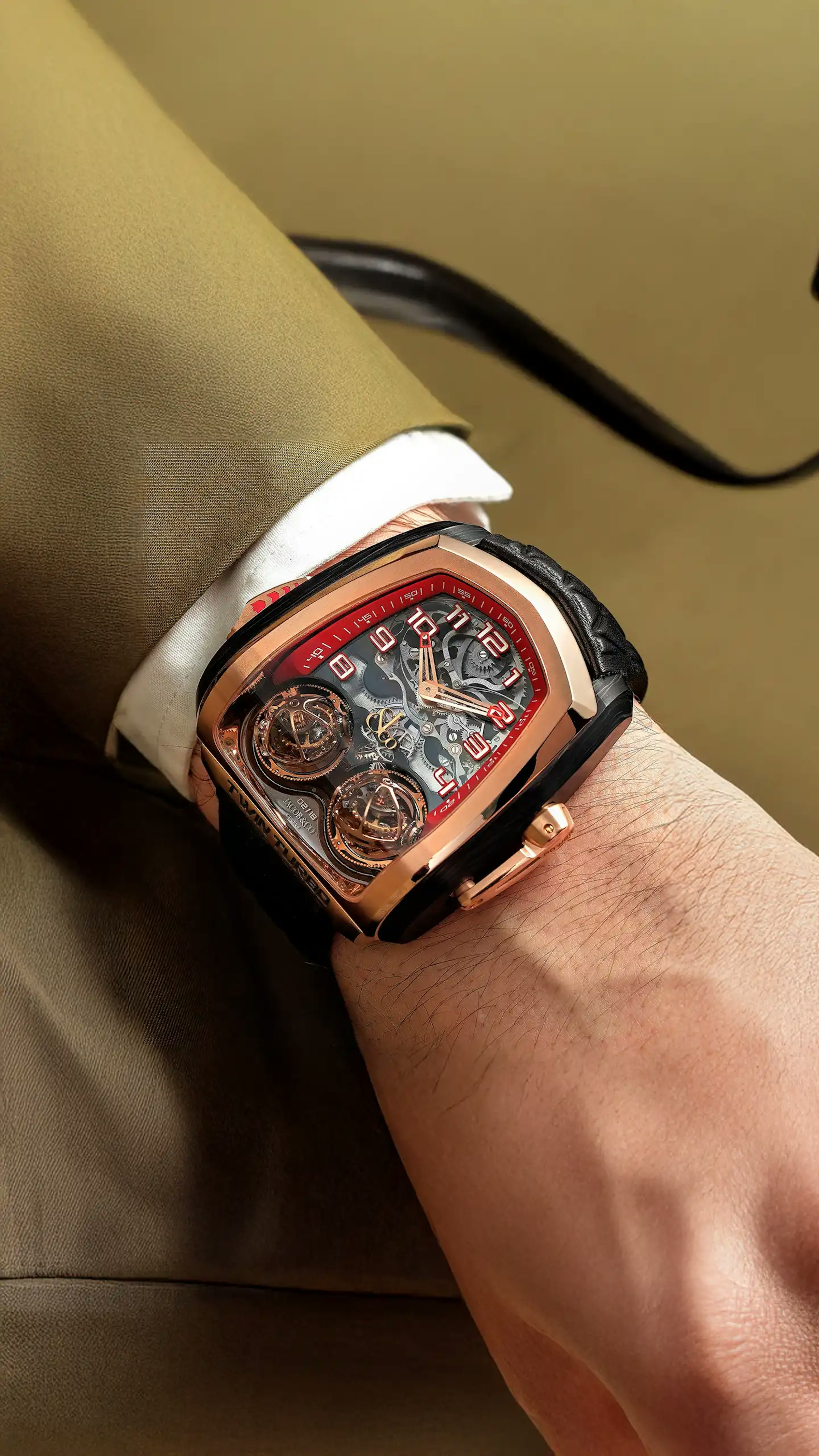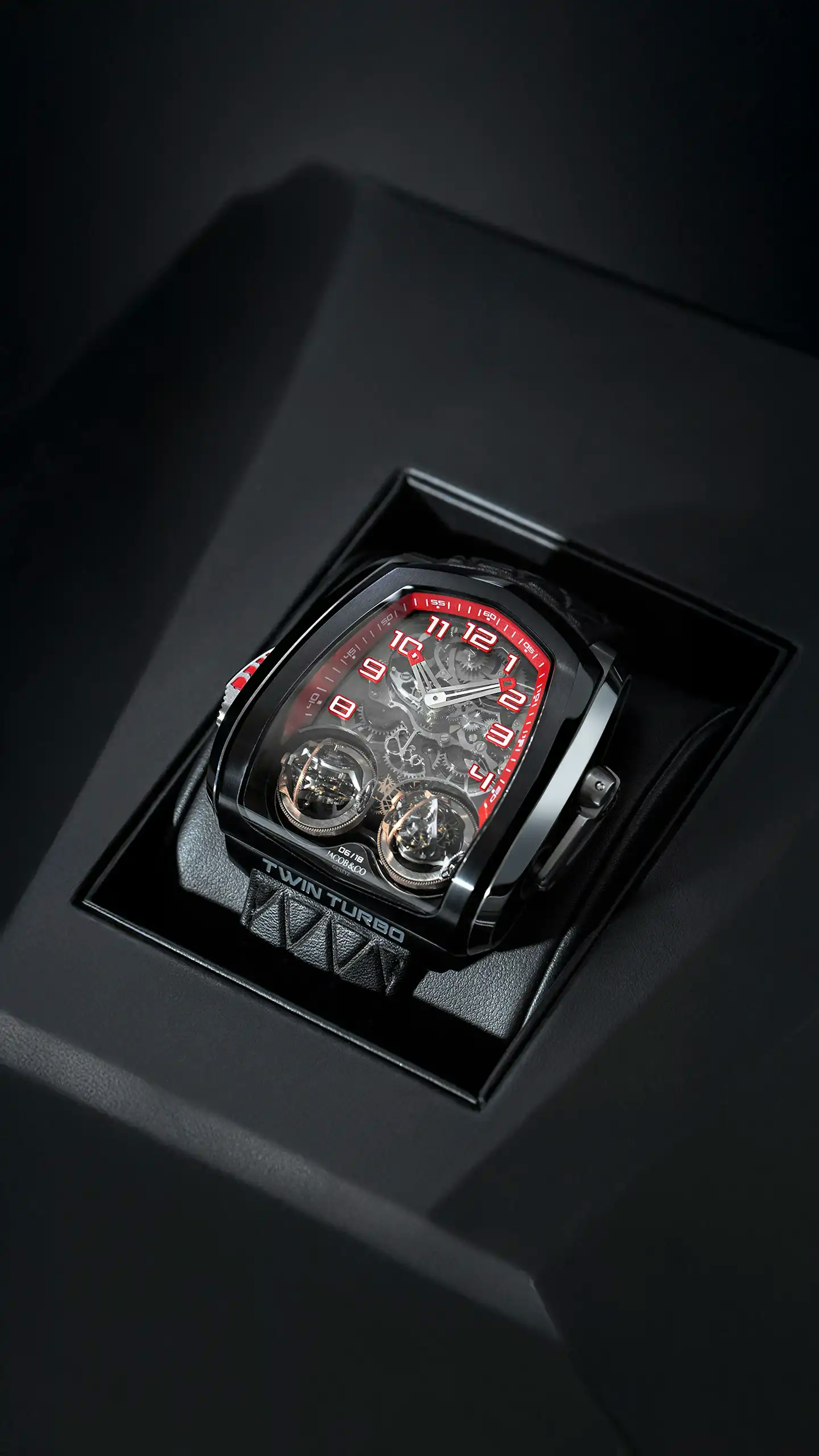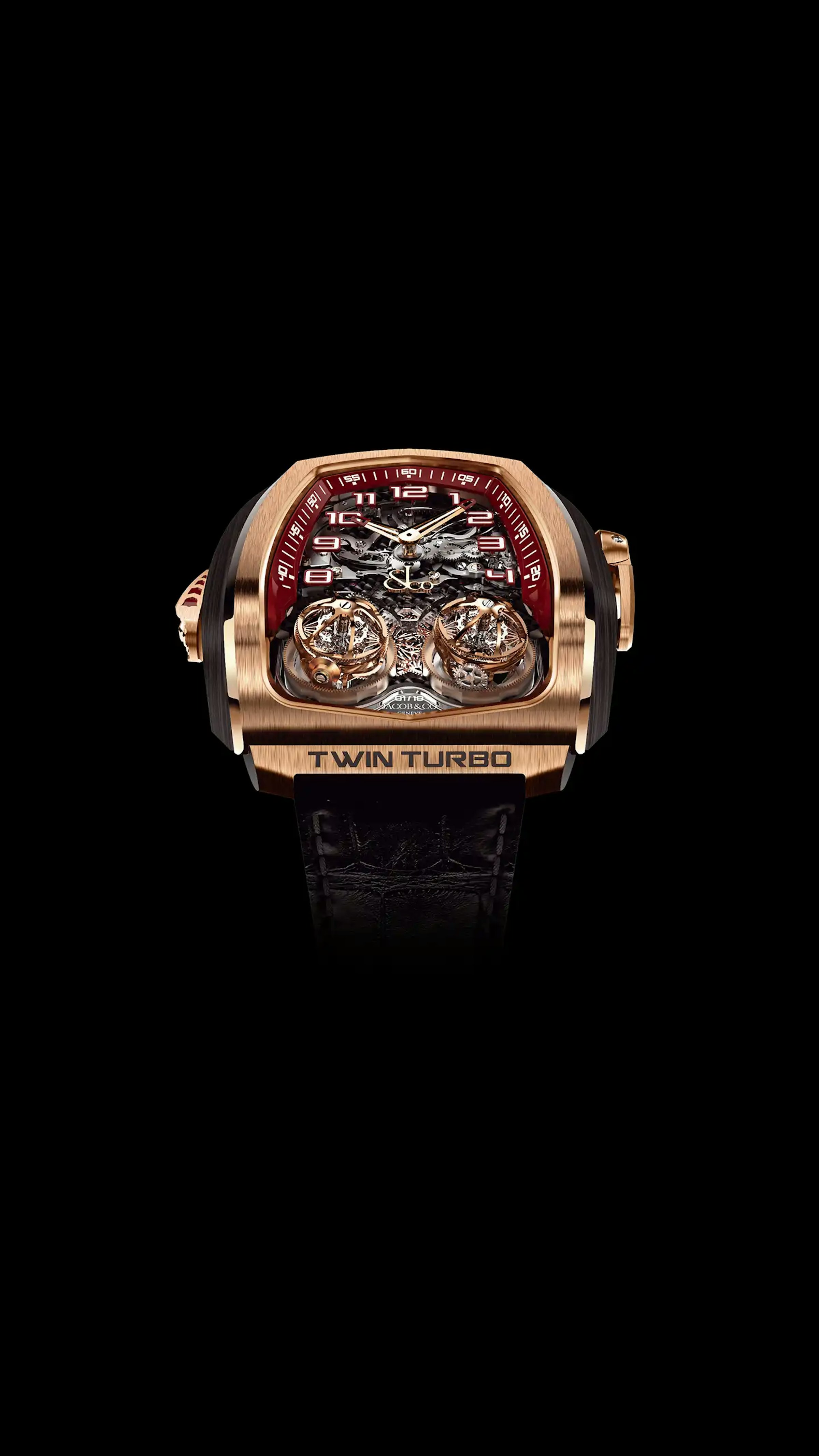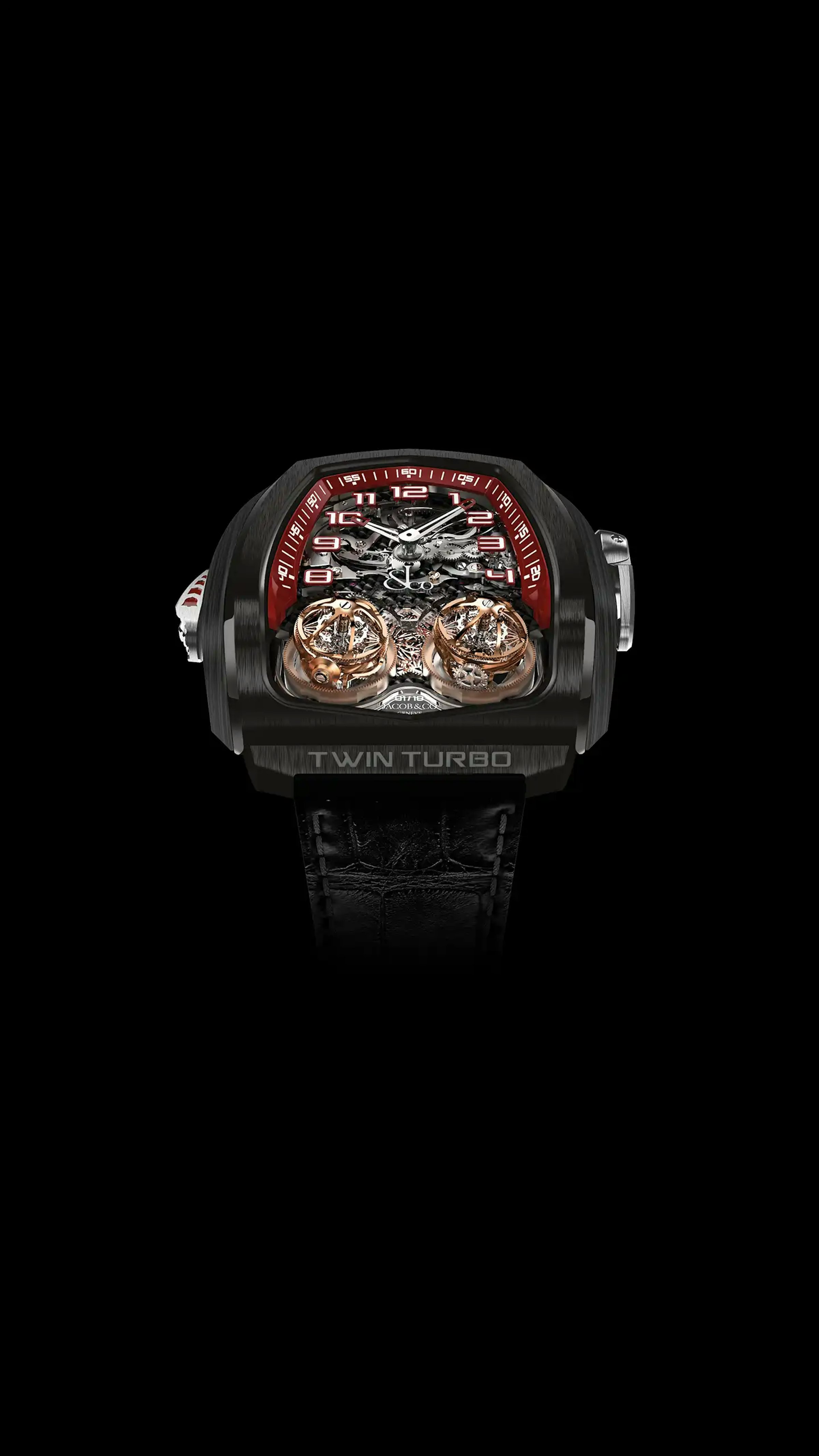 Using the slide on the left flank, the Twin Turbo tells time with sound. The minute repeater function is one of the most prestigious ones. Jacob & Co. made it doubly special. Caliber JCFM01 is a decimal minute repeater : instead of chiming quarters of hours, it chimes once for every 10-minute segment. To enhance its sound, Jacob & Co. used another rare feature : Cathedral gongs. The metal rods bent around the movement are almost twice as long as traditional ones. They produce a deeper, longer, more intense sound.