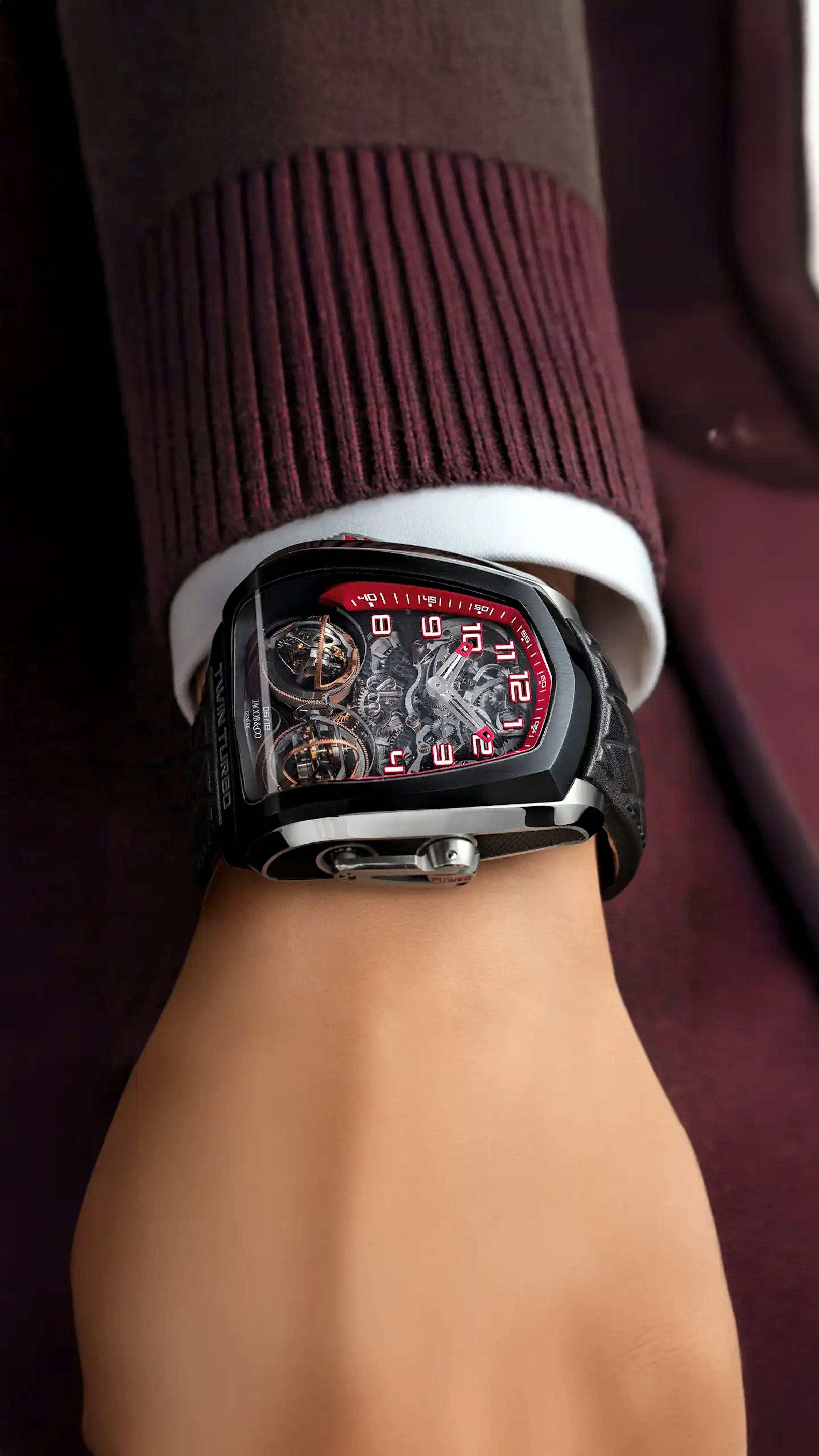 Winding caliber JCFM04 and filling up its 72-hour tank can be a lengthy process. To make it more ergonomic and pleasant, the Twin Turbo’s crown is shaped like a crank, engraved with the word “POWER”.